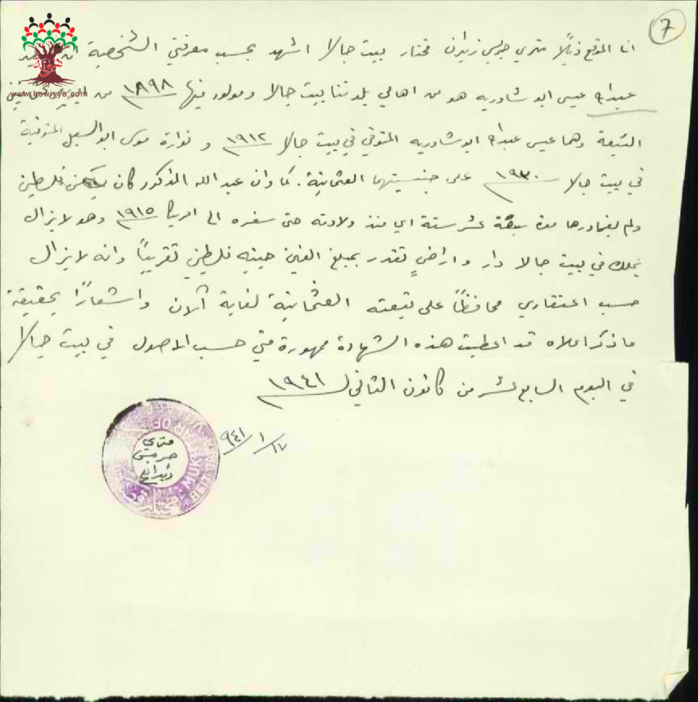 لا شك أن الدافع الأساس هو التمسك بحقه الطبيعي في وطنه وأرضه وأملاكه.. وهذا واضح في شهادة مختار بيت جالا الذي يؤكد في إحدى الوثائق أن والديّ عبدالله قد توفيا ودفنا في بيت جالا وأنه لا يزال يملك بيتاً فيها قيمته تقارب الـ 2000 جنيه ولا يزال محتفظا ًبتبعيته العثمانية التي سافر على أساسها..