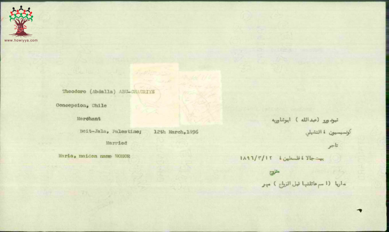 مرفق مجموعة من الوثائق التي تخص السيد عبدالله (ثيودورو) أبو شاورية المولود في بيت جالا عام 1896 تقريباً، وقد هاجر إلى تشيلي عام 1911 واستقر في مدينة كونسبسيون حيث عمل بالتجارة وتزوج وأنجب أربعة أطفال حتى العام 1940، حين تقدم بطلب رسمي لاستعادة جنسيته الفلسطينية في شهر أيلول/سبتمبر 1940.. وقد استعادها فعلاً في شهر آذار/مارس 1941 كما هو مبيّن في الوثائق.