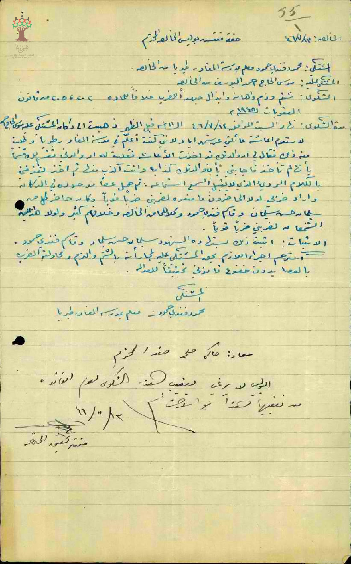 شكوى قدح وذم من قبل الاستاذ محمود فندي حمود الخالصة -مدرسة المغار بحق موسى احمد الحاج اليوسف وذلك بسبب انكار الاستاذ استلامه الاعاشة الخاصة بوالدته بشهادة سليمان حسن سليمان و قاسم فندي حمود