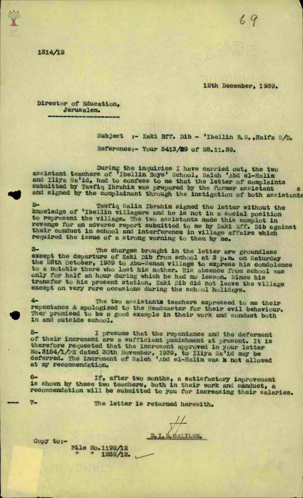 اخطار من مفنش دائرة المعارف في الجليل الى مدير دائرة المعارف متعلق بنتيجة التحقيق في الشكوى الموجهة بحق مدير مدرسة عبلين للبنين الاستاذ زكي ديب و التي تبين انها ملفقة من قبل المدير السابق بالتعاون مع المعلمين صالح عبد الحليم و علية سعيد مع التوصية بعدم تصعيد العقوية و البقاء على الخصم لمدة شهرين و اعادة التقييم لسلوكهم لاحقاً