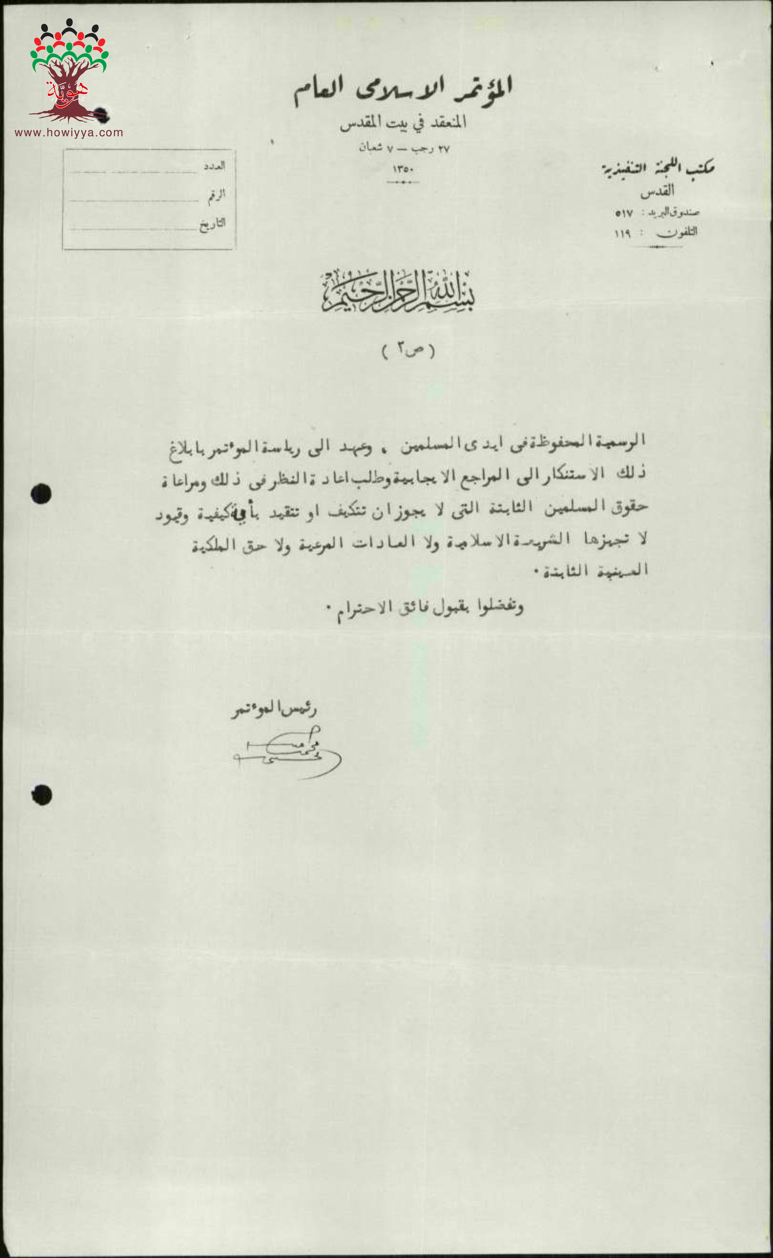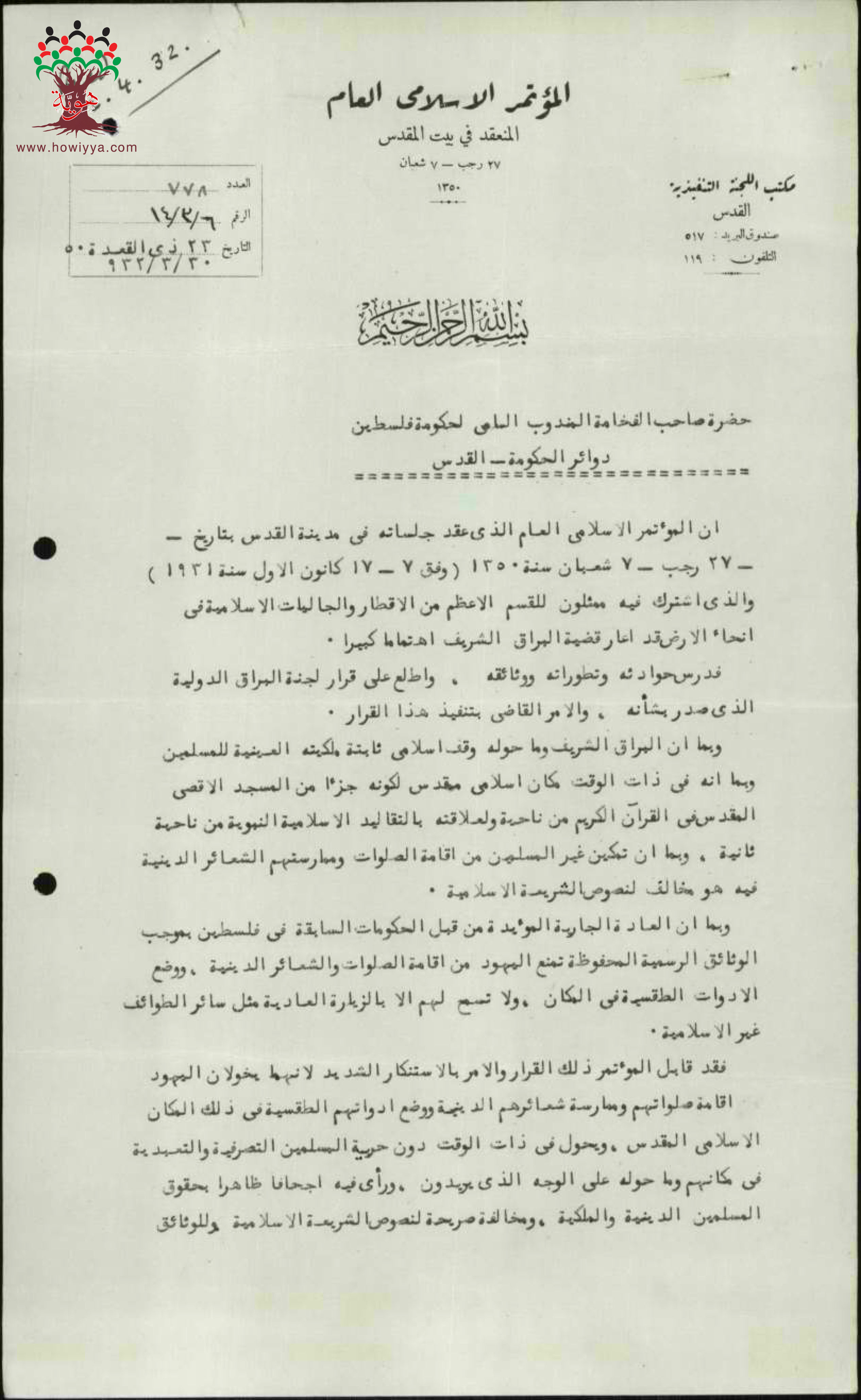بيان المؤتمر الإسلامي العام حول قرار لجنة البراق الدولية - عام 1931، وفيه إدانة للقرار لأنه يعطي غير المسلمين الحق في إقامة الصلوات في المسجد الأقصى وممارسة شعائرهم الدينية فيه.