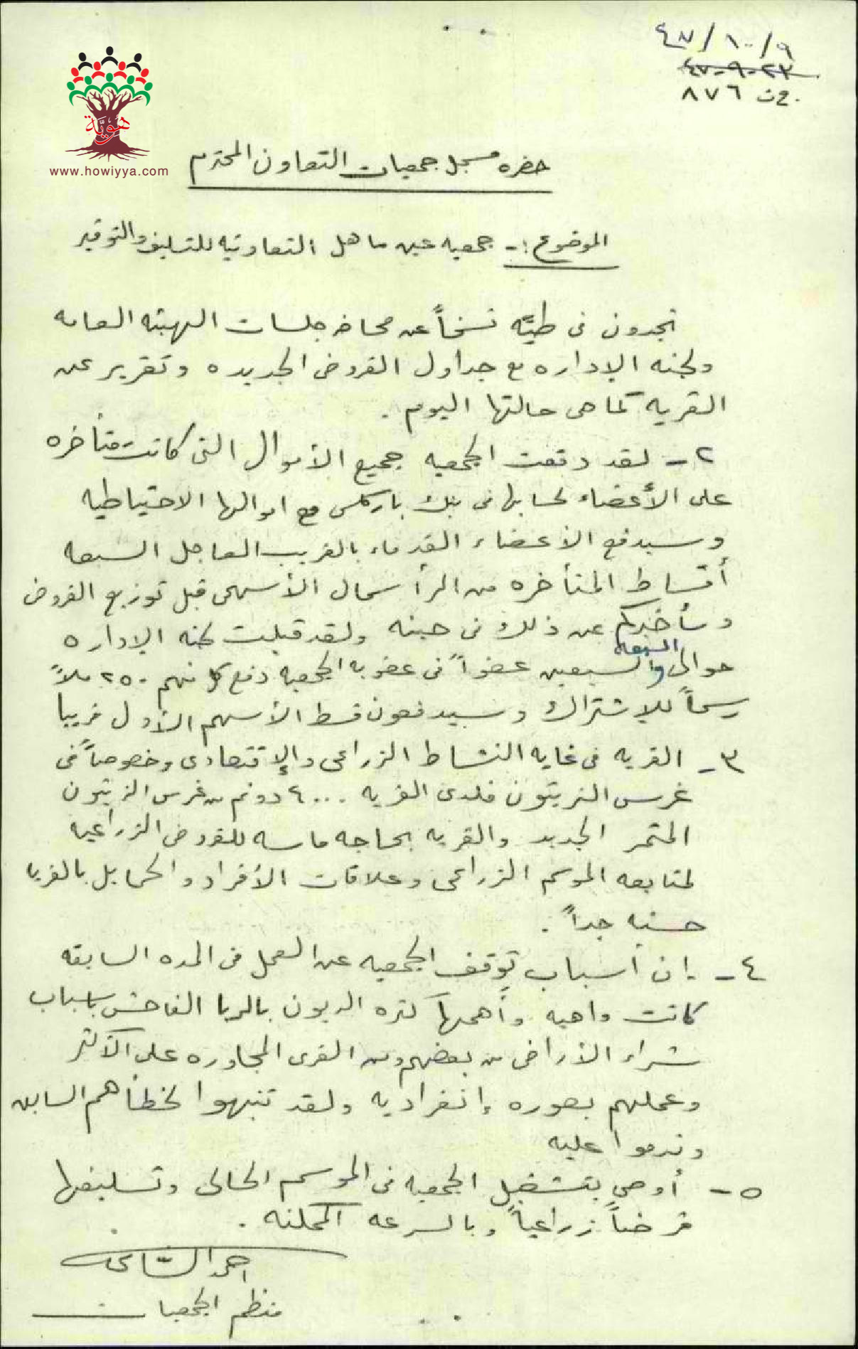 رسالة من أحمد الشامي منظم الجمعيات الى مسجل جمعيات التعاون بخصوص محاضر جلسات الهيئة لجمعية عين ماهل التعاونية