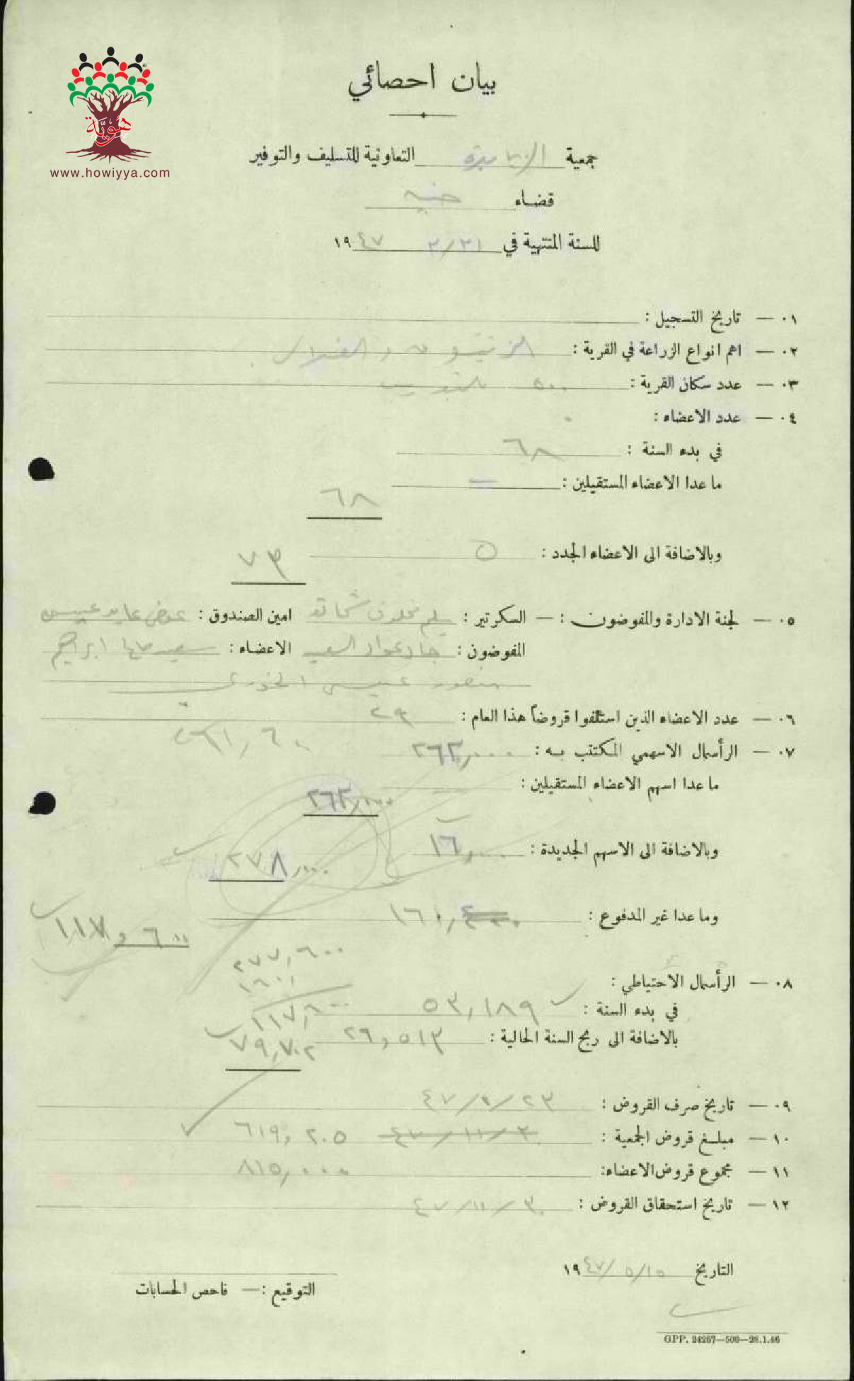 بيان احصائي لجمعية الزبابدة التعاونية للتسليف والتوفير لسنة 1947