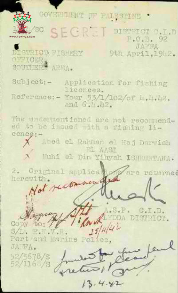 عدم الموافقة على اعطاء رخص صيد لكل من عبد الرحمن درويش العيسى و محي الدين يحيى اشكنتنا