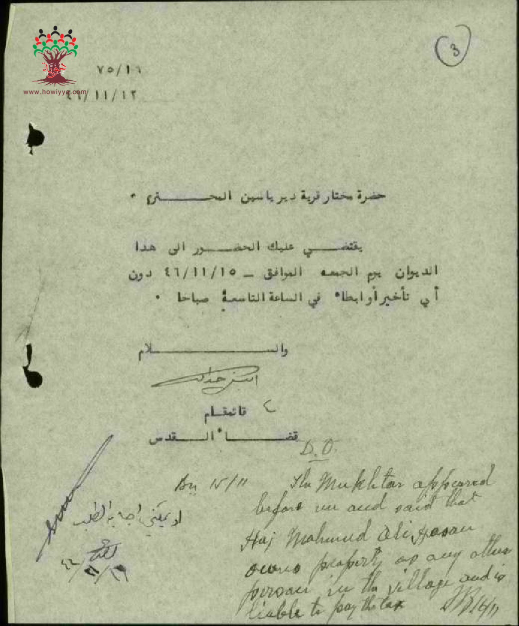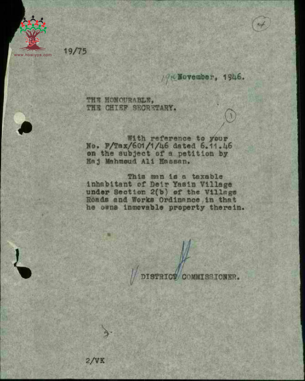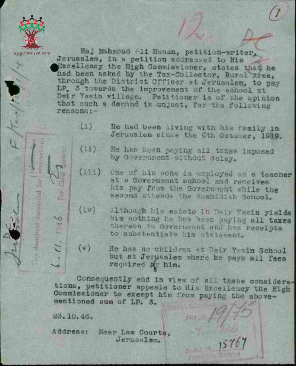الطلب من الحاج محمود علي حسن دفع ضريبة تحسين مدرسة دير ياسين - بحيث قدم المذكور طلباً لإعفائه من دفع هذه الضريبة لأنه يسكن في القدس وليس له أبناء يتعلمون في بلدته دير ياسين ولكن تم رفض طلبه وإلزامه بدفع الضريبة