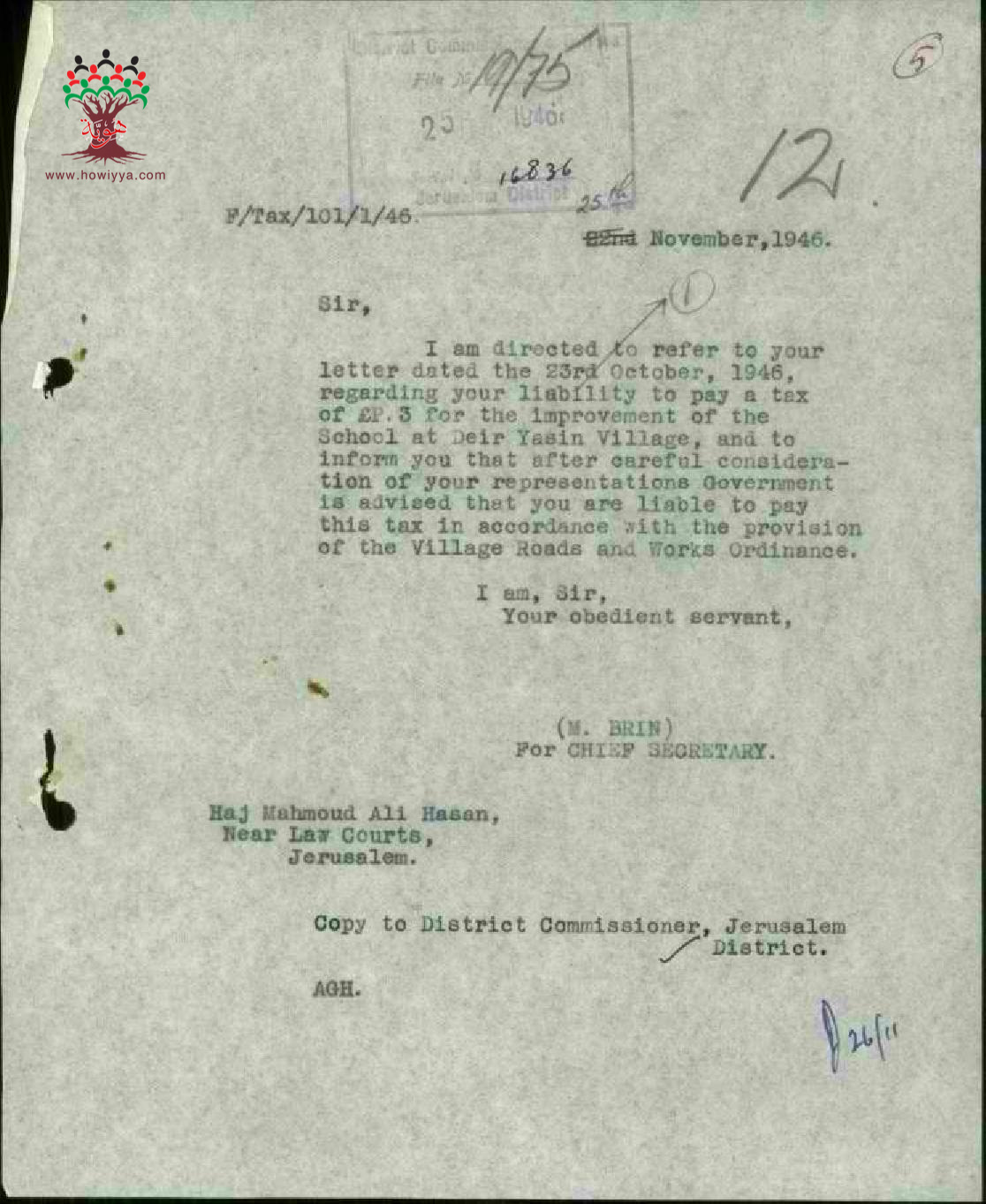 الطلب من الحاج محمود علي حسن دفع ضريبة تحسين مدرسة دير ياسين