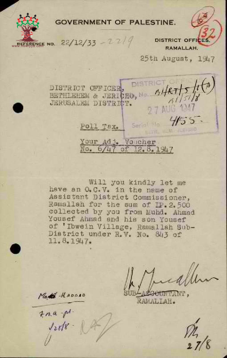 رسالة بخصوص الضرائب التي تم جمعها من أحمد يوسف أحمد وابنه يوسف من عبوين-رام الله