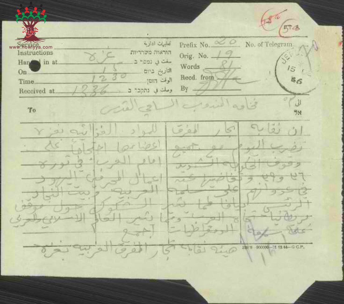 تلغراف مرسل من نقابة تجار المفرق للمواد الغذائية ب غزة الى المندوب السامي احتجاجا على اعتداء اليهود على شبان من قرية سلمة