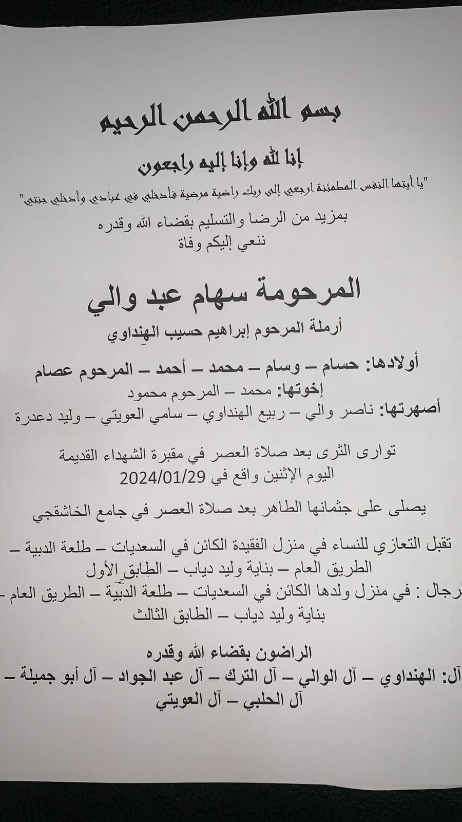 ورقة نعوة - المرحومة سهام عبد والي المتوفاة في 29/01/2024