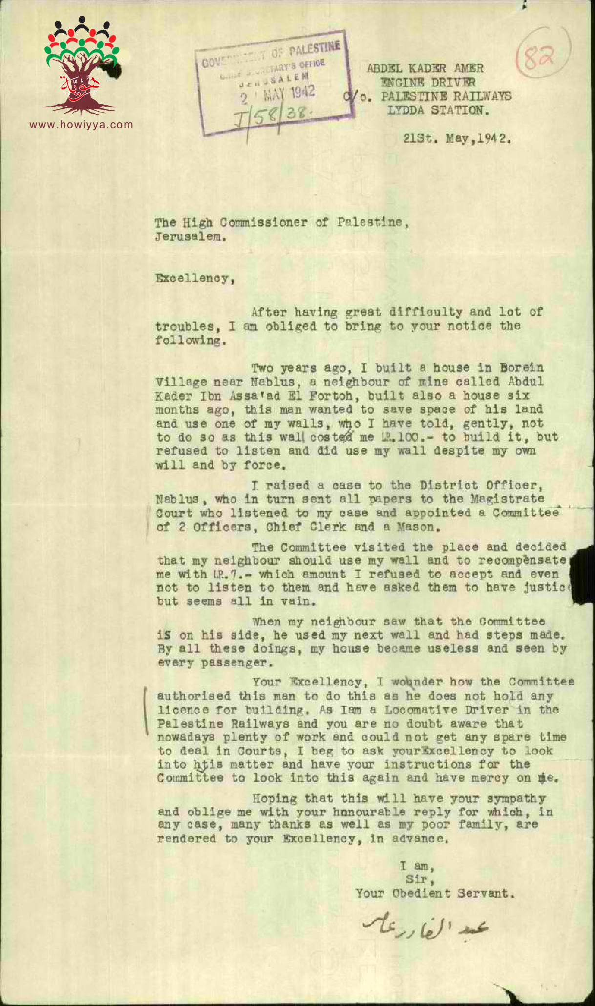 شكوى مقدمة من عبد القادر عامر الى المندوب السامي ضد جاره عبد القادر عيسى فتوح حيث قام ببناء منزله على حائطه