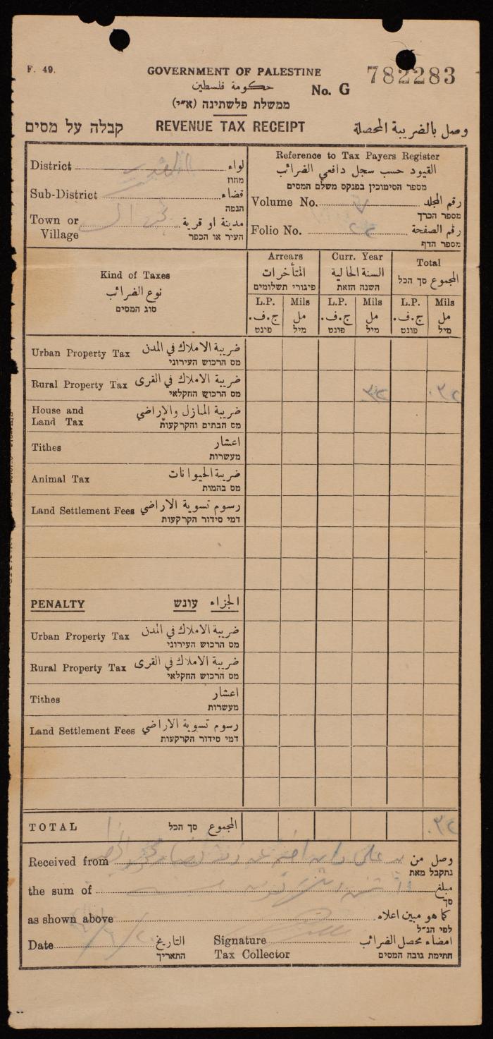 وصل بالضريبة المحصلة من علي نصار محمود الخطيب على أملاكه في قرية بيت إكسا بقيمة إثنين وثلاثون ملا