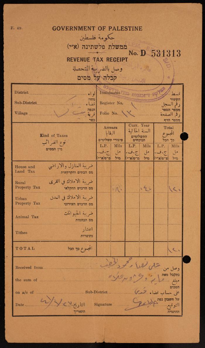 وصل بالضريبة المحصلة من علي نصار محمود الخطيب