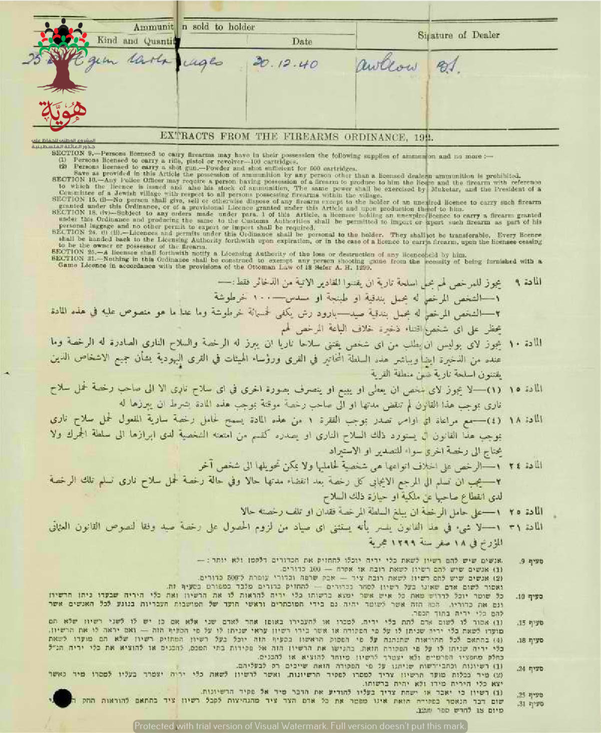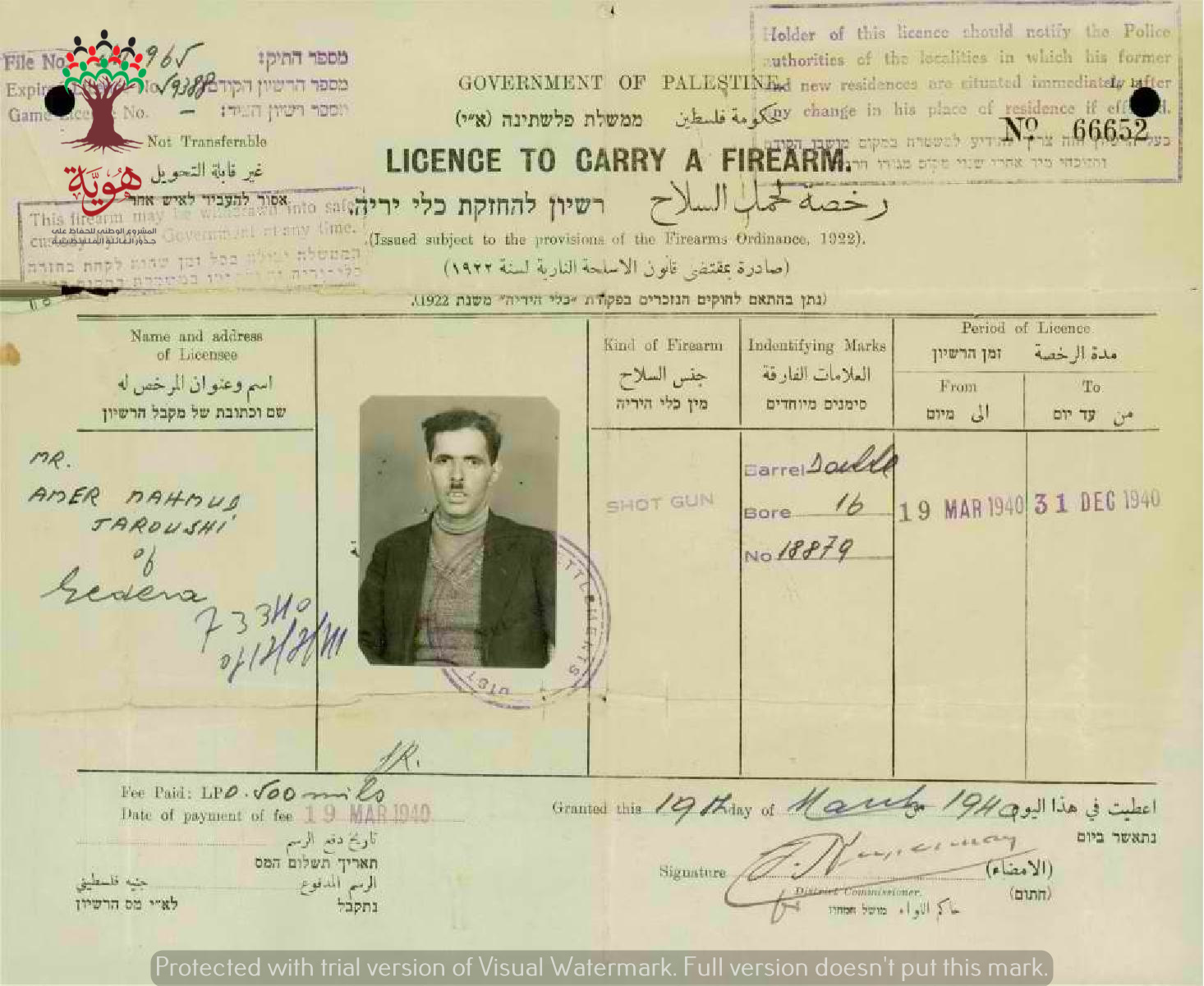 رخصة لحمل السلاح - عامر محمود جاروشة - 1940