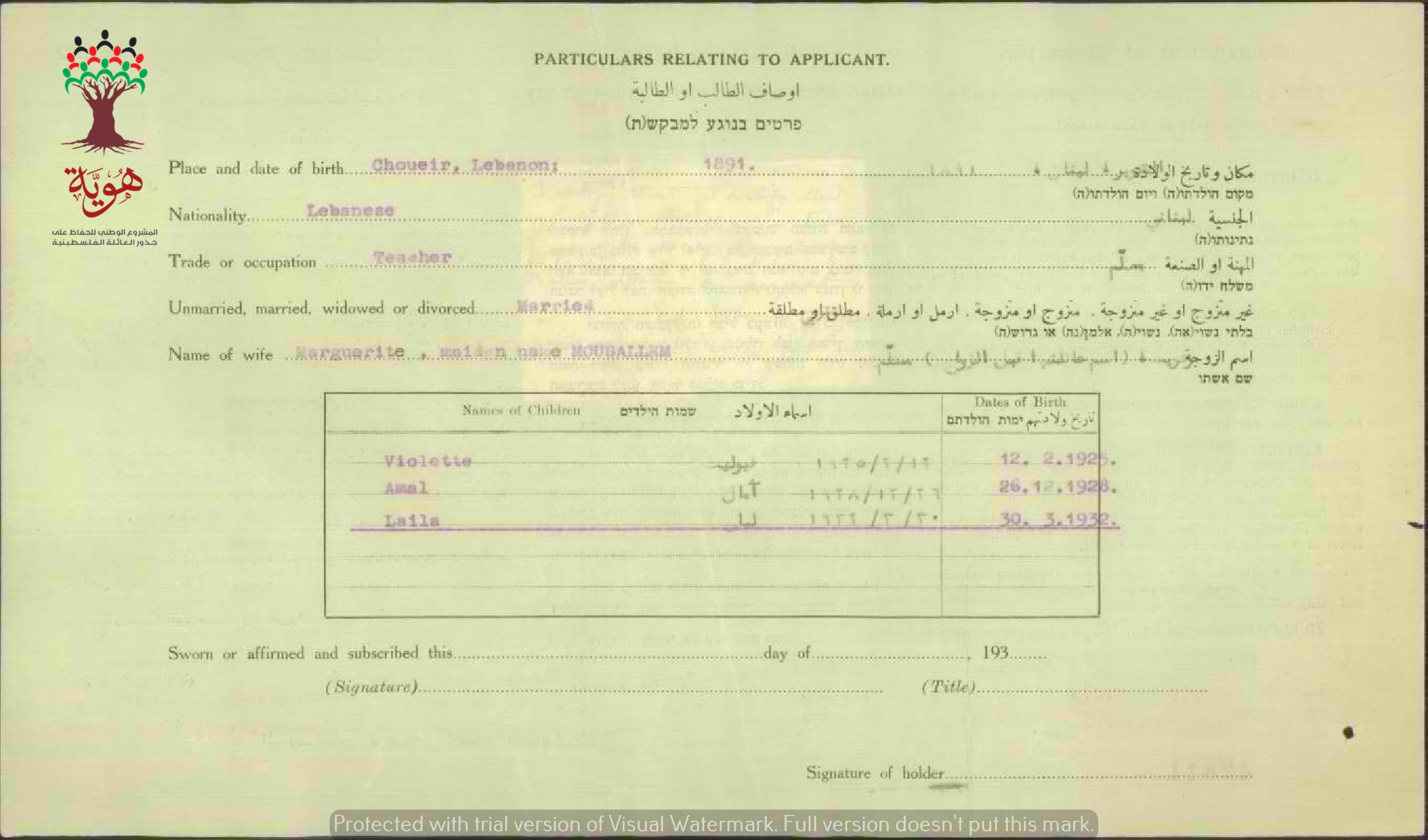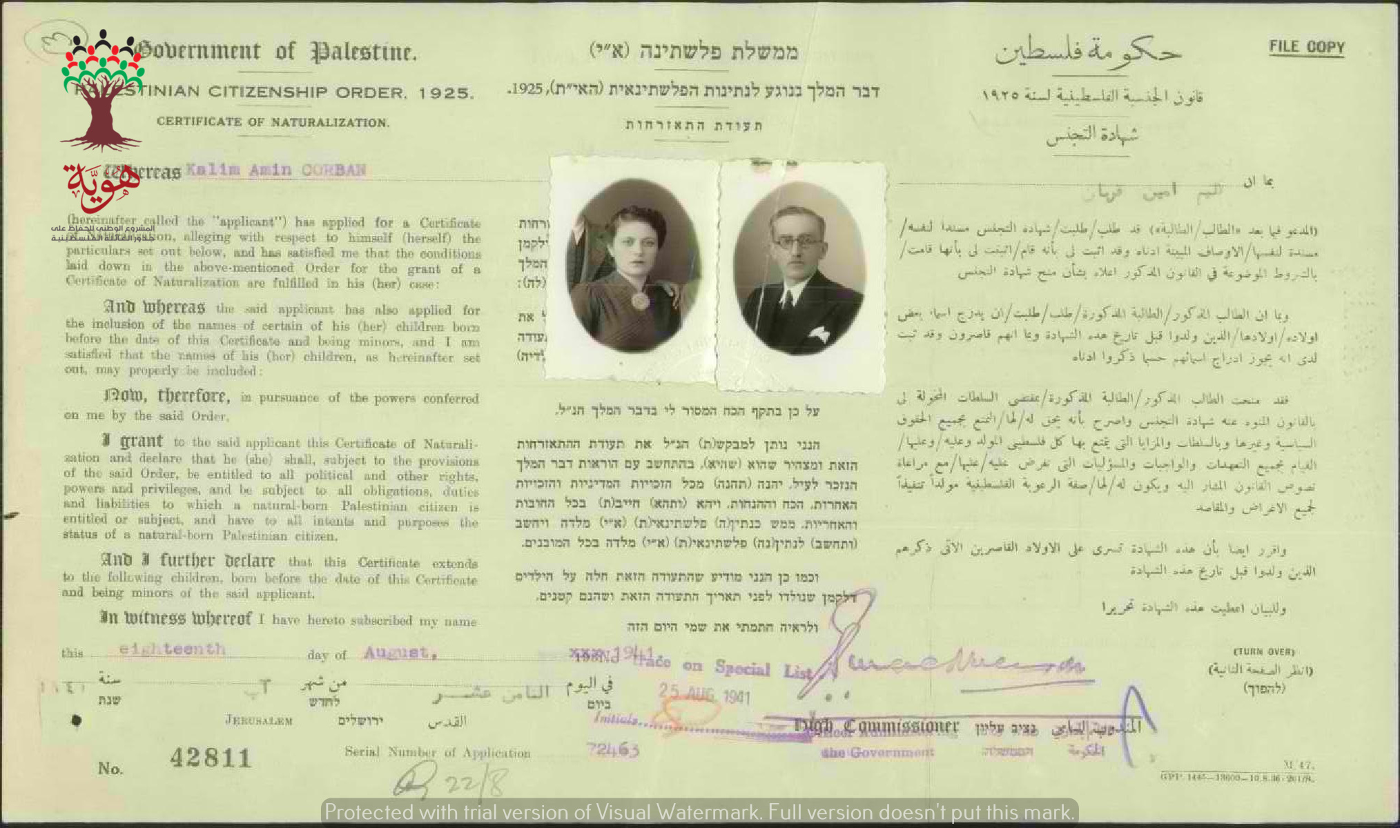شهادة الجنسية الفلسطينية ل كليم قربان- حيفا