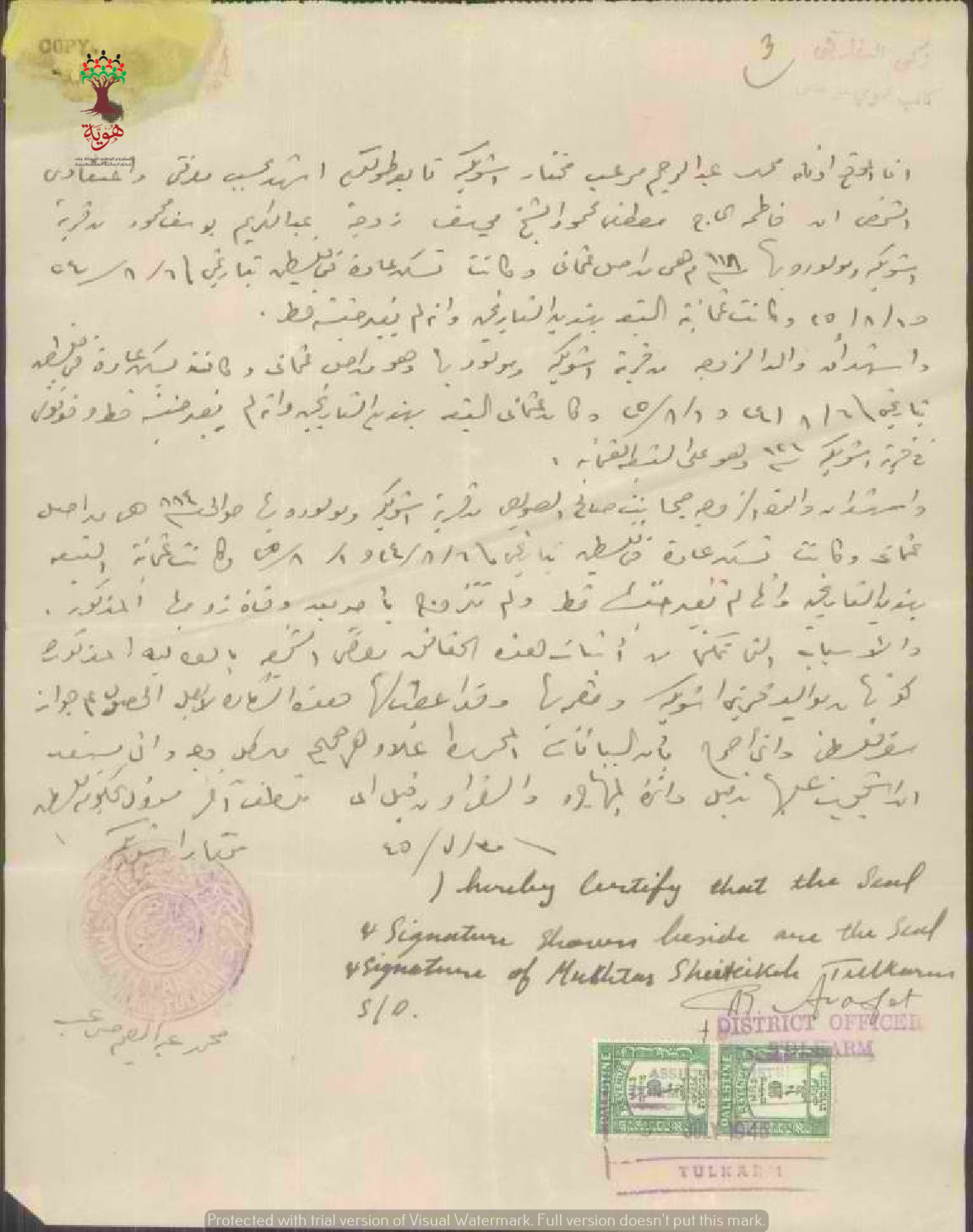 شهادة من المختار للسيدة فاطمة يوسف زوجة عبد الكريم محمود بخصوص طلب الجنسية/ شويكة