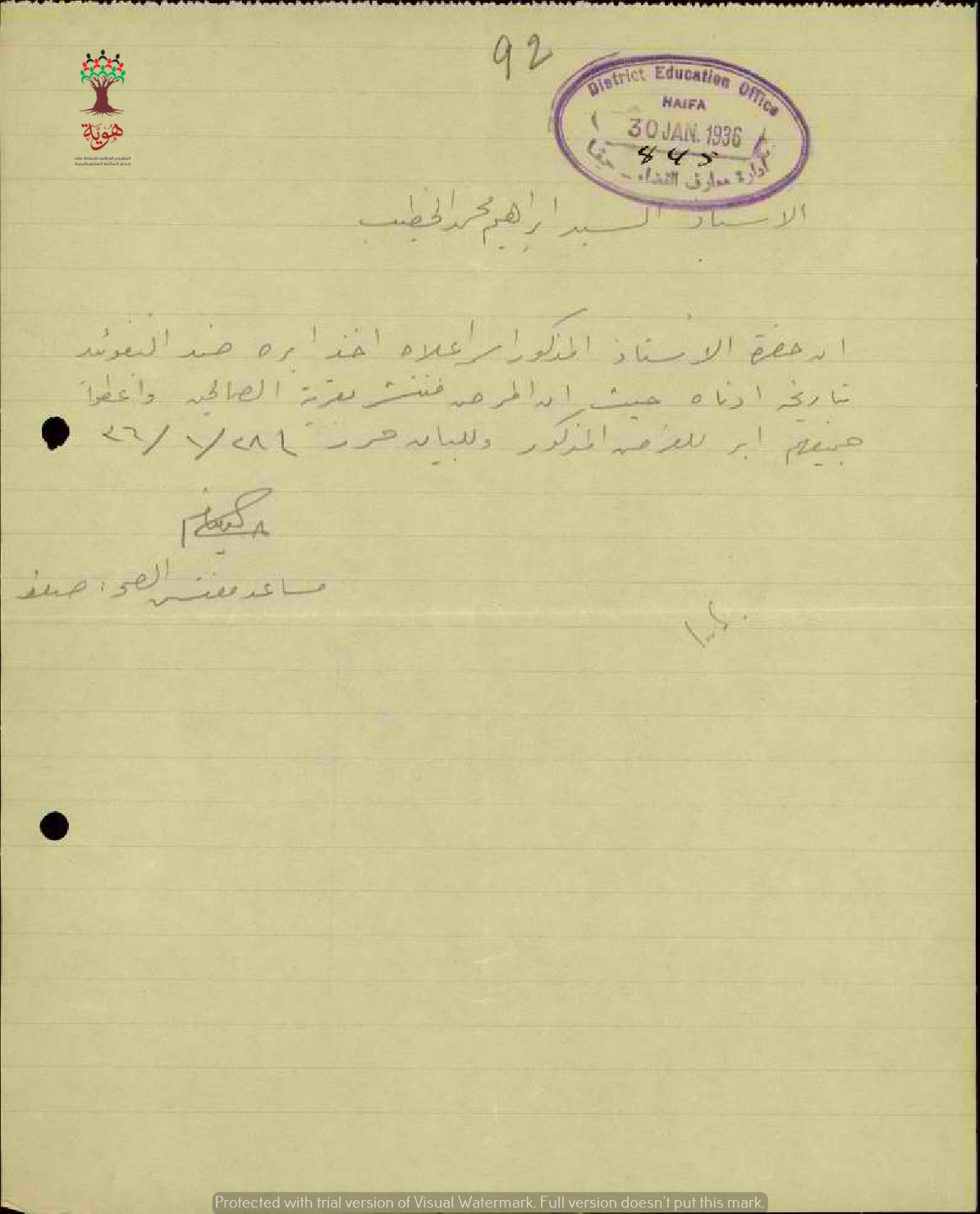 شهادة من مساعد مفتش الصحة بأن المعلم ابراهيم الخطيب قد أخذ ابرة ضد التفوئيد