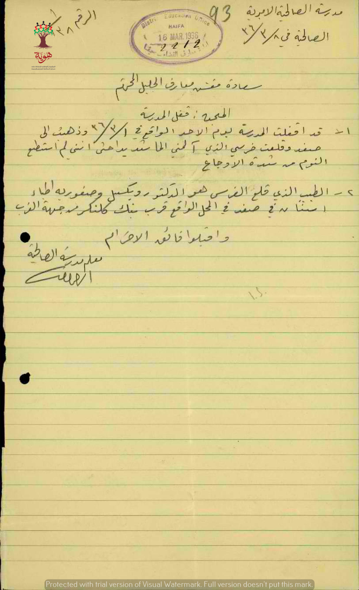 رسالة من المعلم ابراهيم الخطيب الى مفتش المعارف بخصوص اقفال المدرسة بسبب قلع درسه