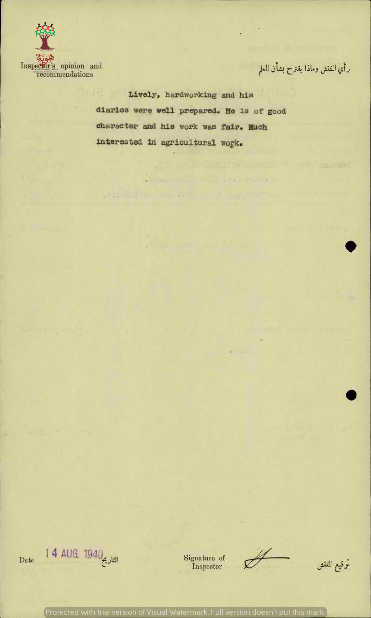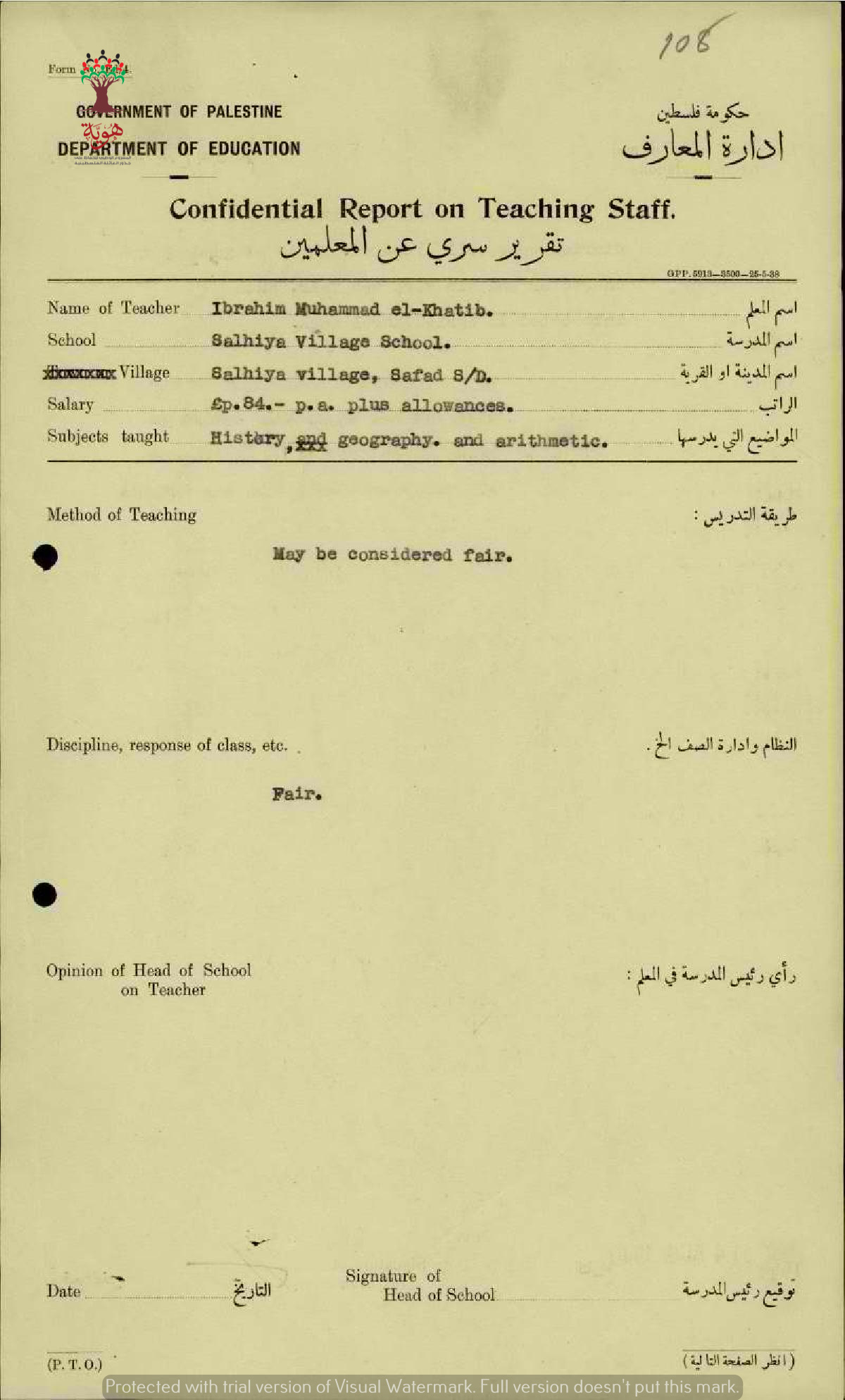 تقرير تفصيلي عن أداء المعلم ابراهيم محمد الخطيب في مدرسة الصالحية سنة 1940