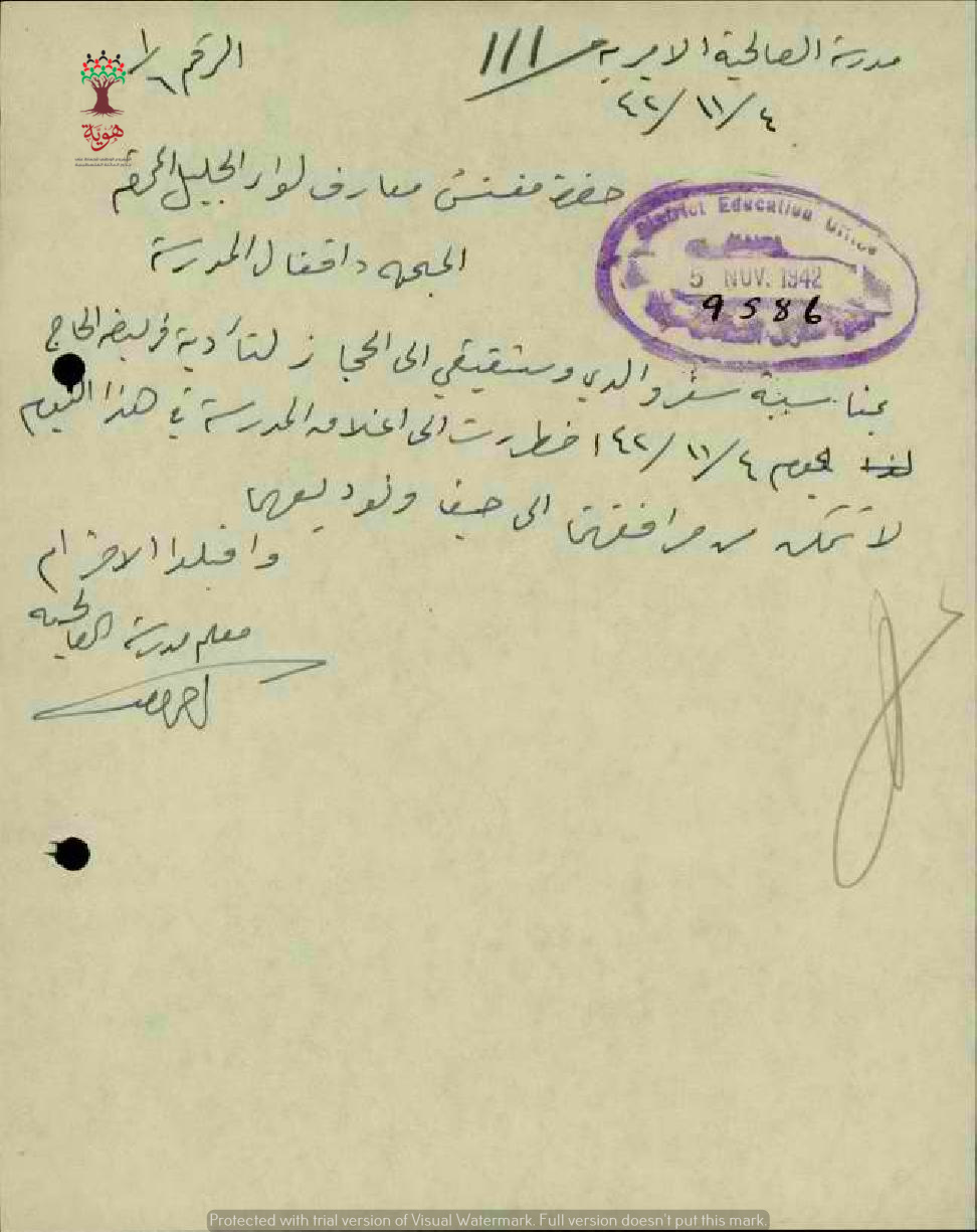 رسالة من المعلم ابراهيم الخطيب الى مفتش المعارف بخصوص اقفاله للمدرسة بسبب مغادرته لتوديع والده وشقيقه المسافران الى الحج