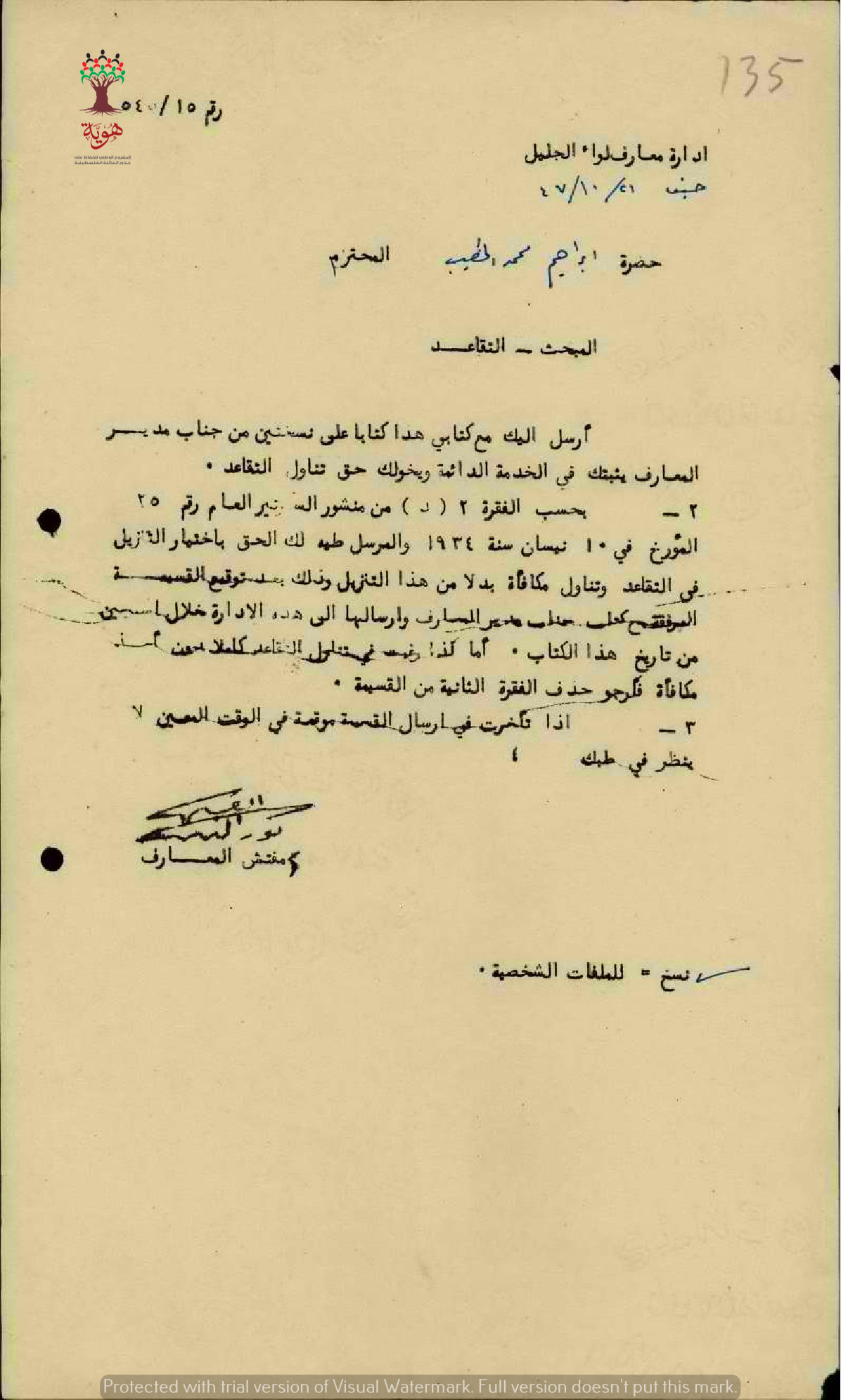 رسالة من مفتش المعارف الى المعلم ابراهيم الخطيب بخصوص تثبيته في الخدمة وحقه في تناول التقاعد