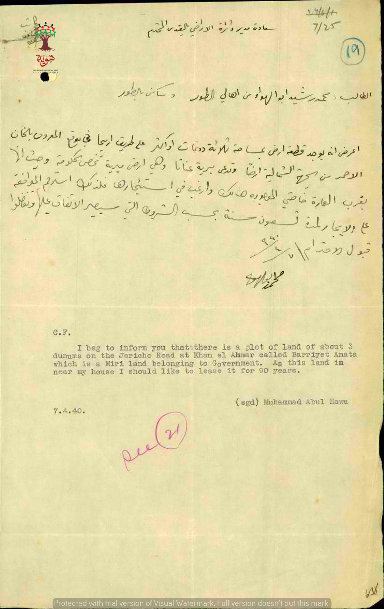 طلب من محمد رشيد أبو الهوا من قرية الطور إلى مدير دائرة الأراضي بالقدس لاستئجار أرض (برية عناتا) ومساحتها 3 دونمات لمدة تسعين سنة.