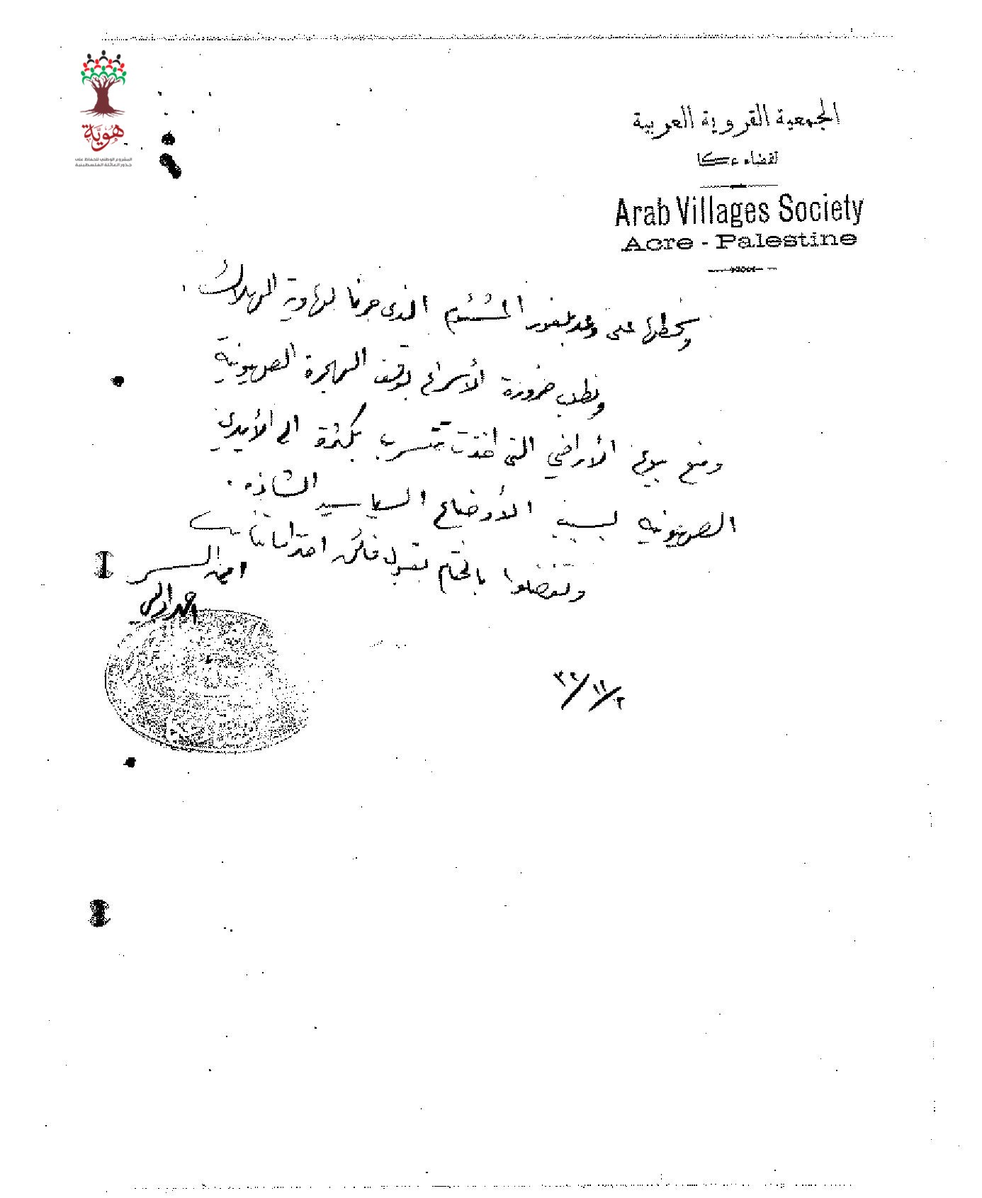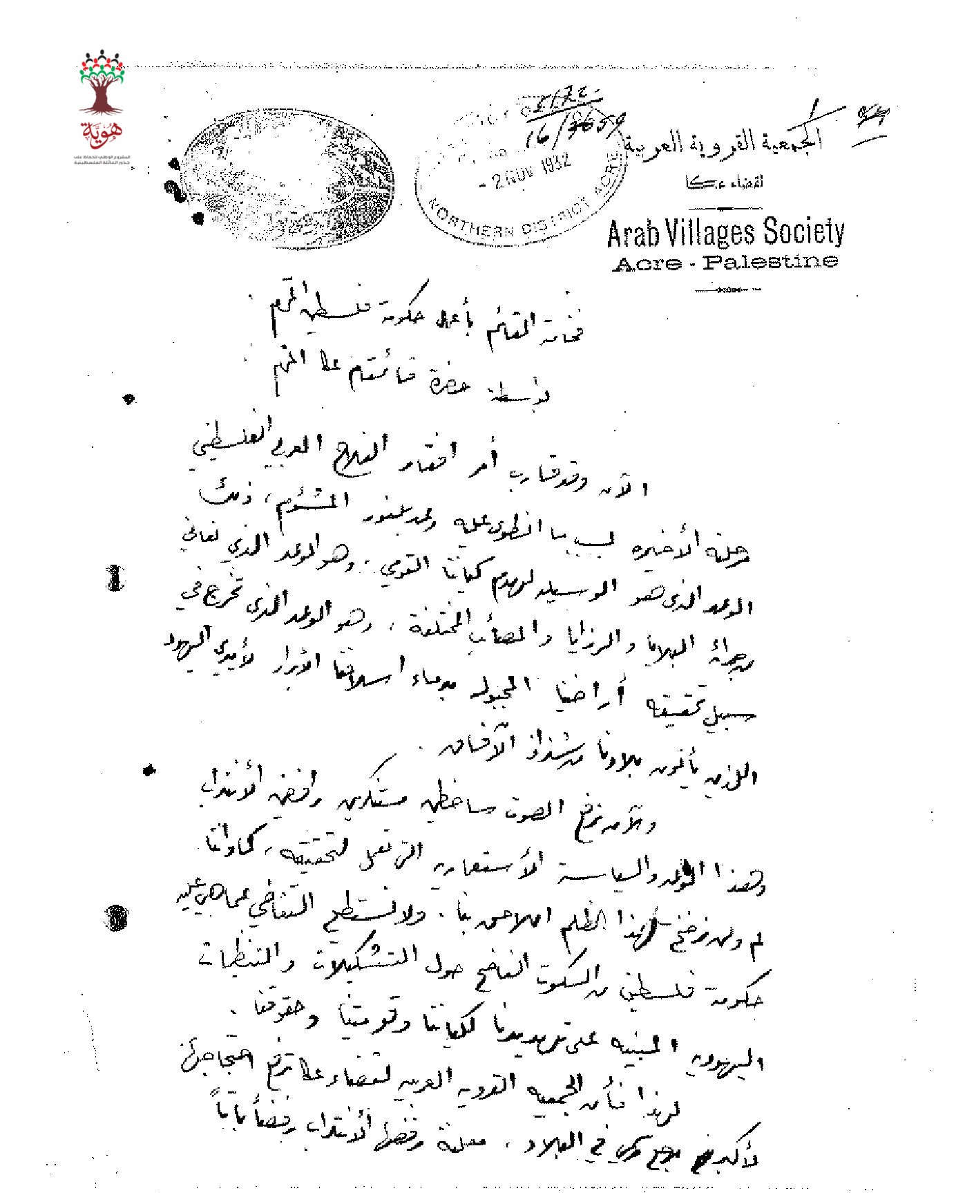 رسالة من الجمعية القروية العربية لقضاء عكا الى القائمقام بأعمال حكومة فلسطين احتجاجا على وعد بلفور مطالبين بضرورة وقف هجرة اليهود الى فلسطين ومنع بيع الأراضي لهم.