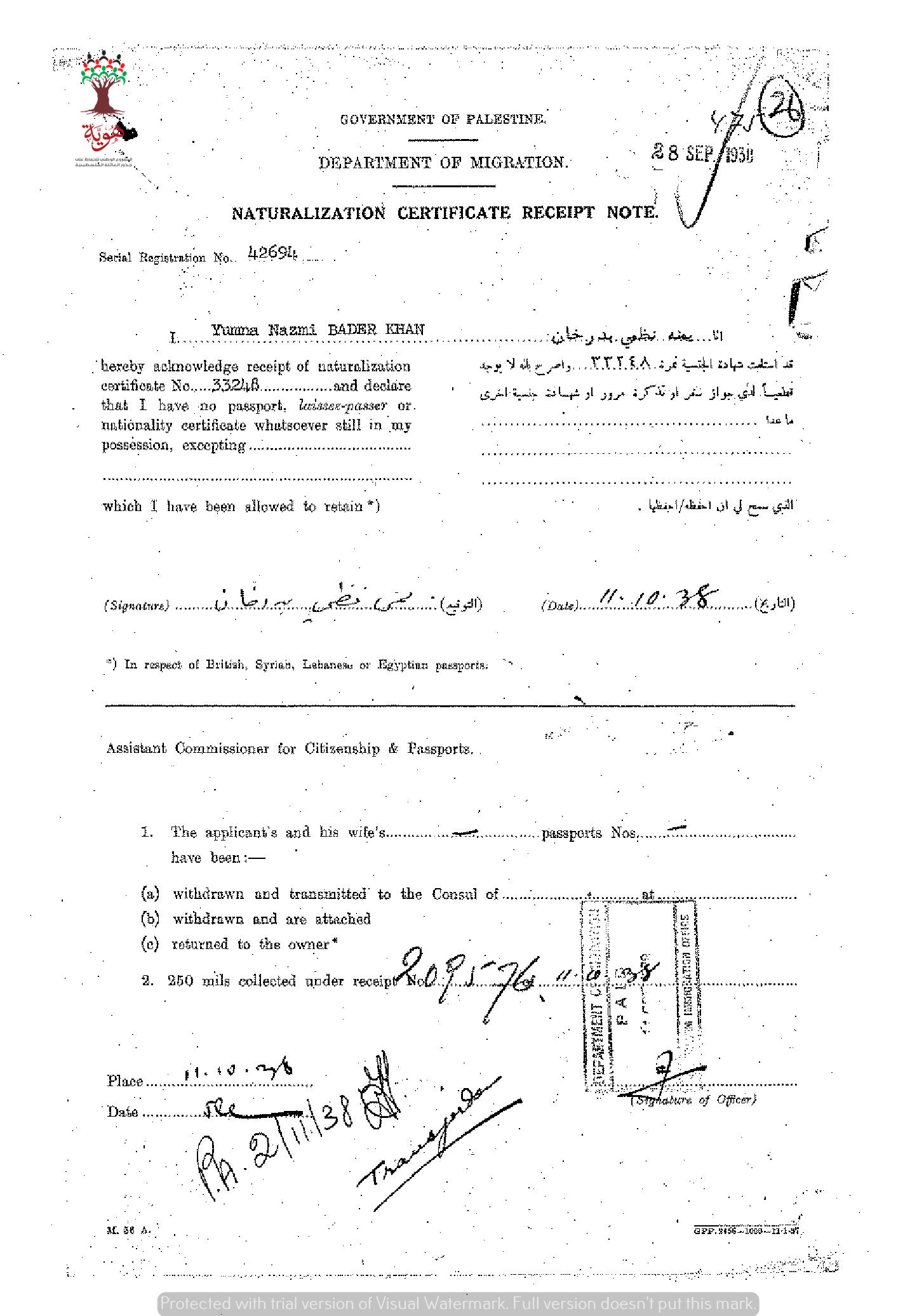 إيصال موقع من يمنة بدرخان باستلام شهادة الجنسية الفلسطينية