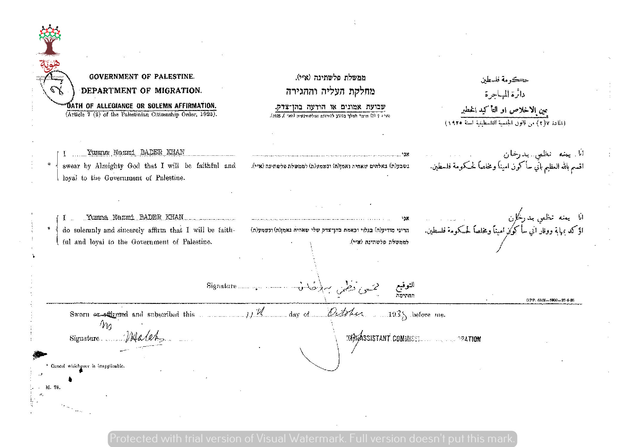 يمنة بدرخان توقع على (يمين الإخلاص) للحصول على الجنسية الفلسطينية