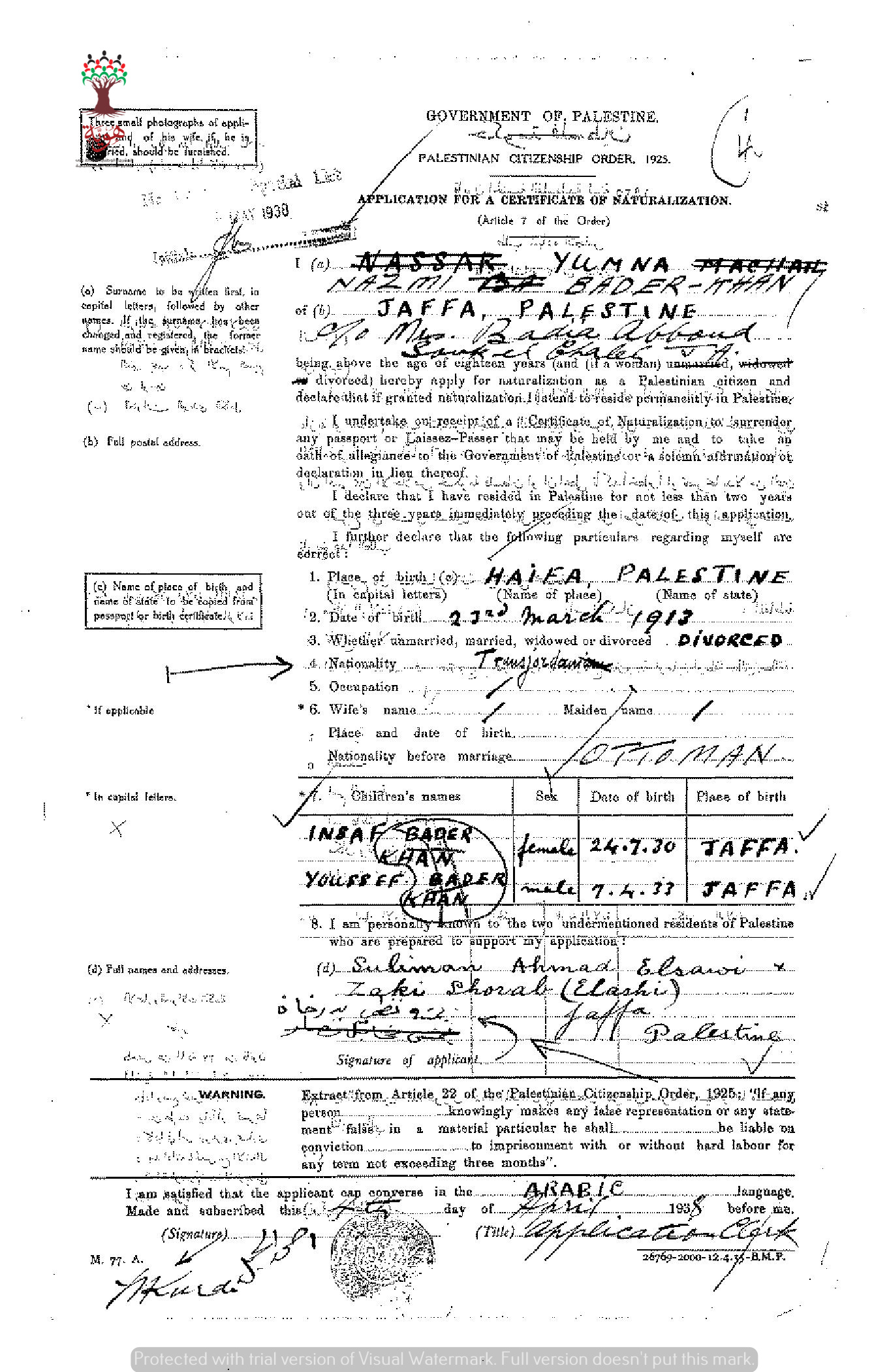 طلب الجنسية الفلسطينية-يمنة بدرخان-يافا/الأردن