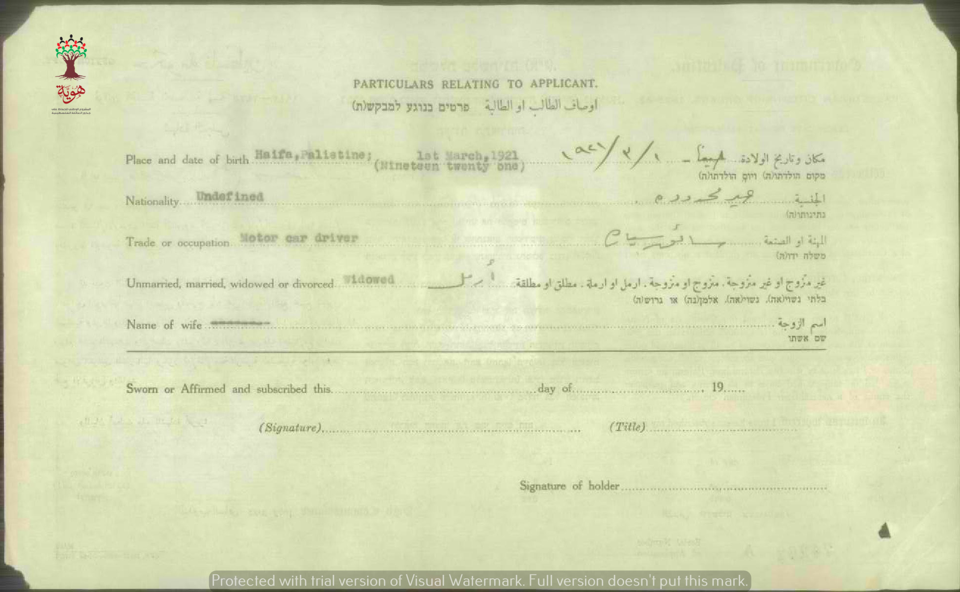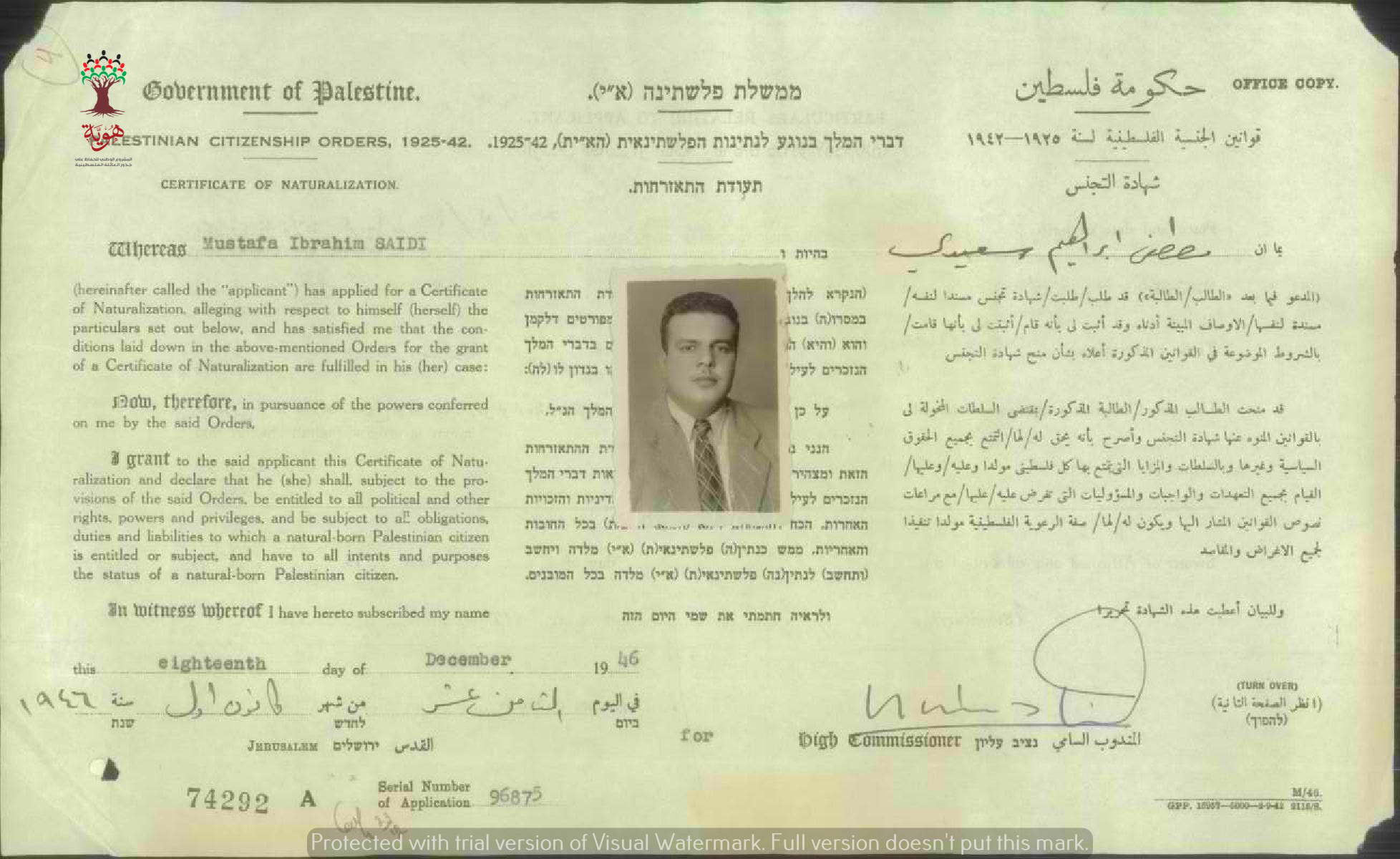 شهادة الجنسية الفلسطينية ل مصطفى إبراهيم سعيدي