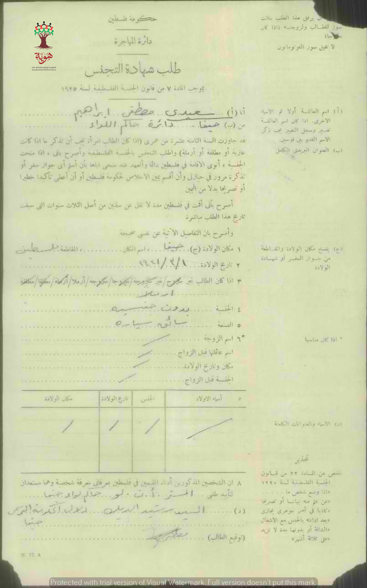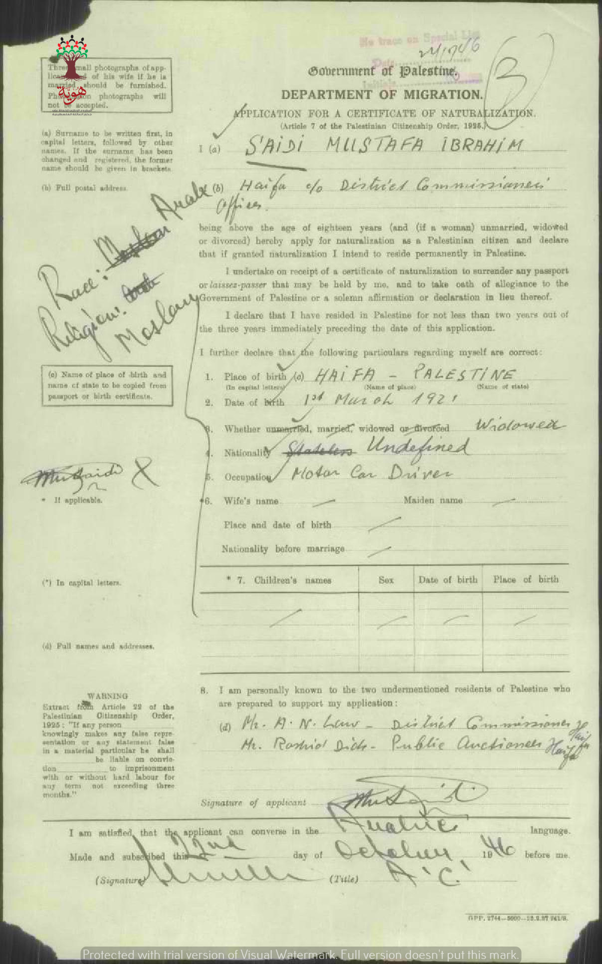 طلب الجنسية الفلسطينية-مصطفى إبراهيم سعيدي-حيفا