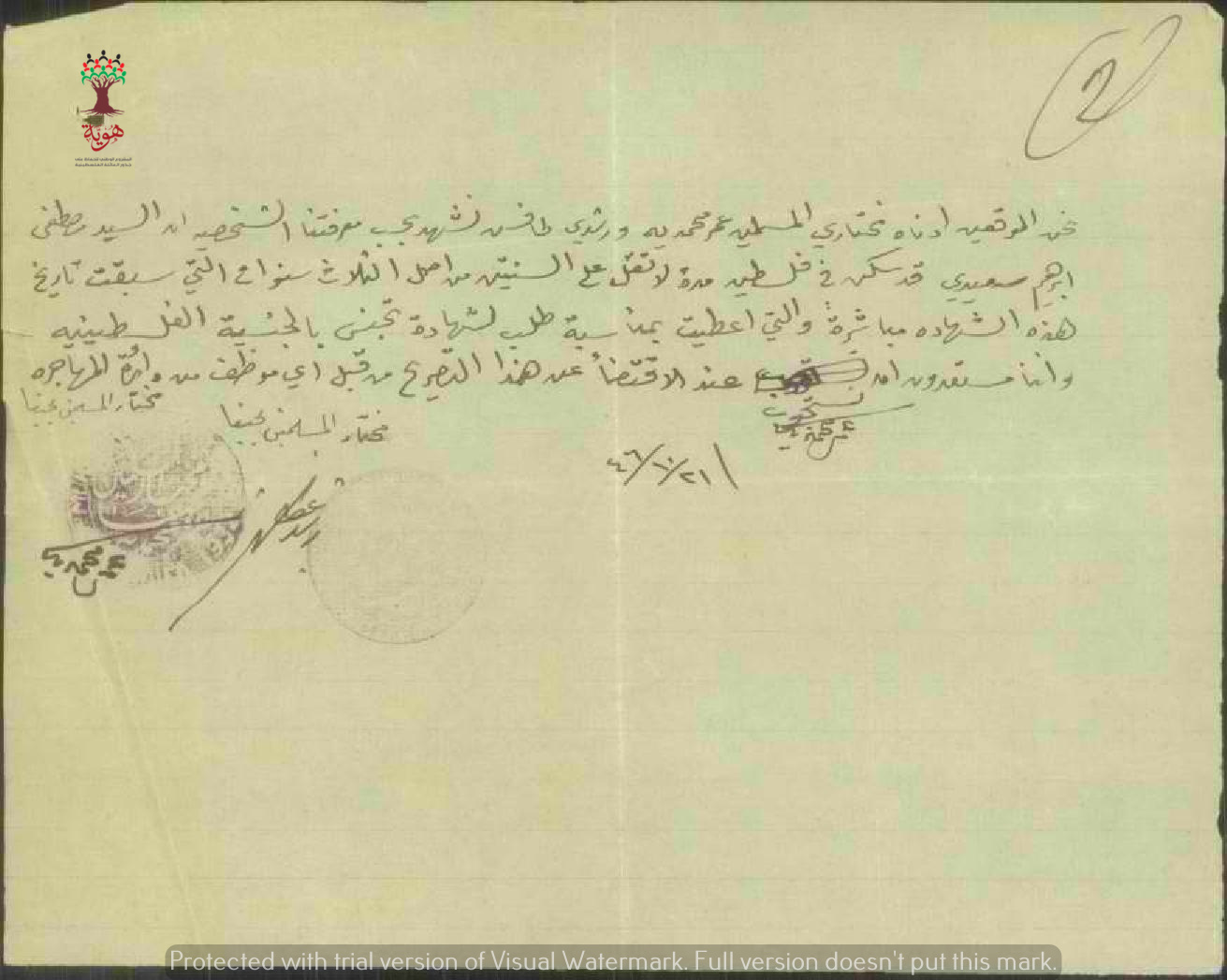 شهادة من مختاري المسلمين في حيفا للسيد مصطفى إبراهيم سعيدي بخصوص طلب الجنسية/حيفا