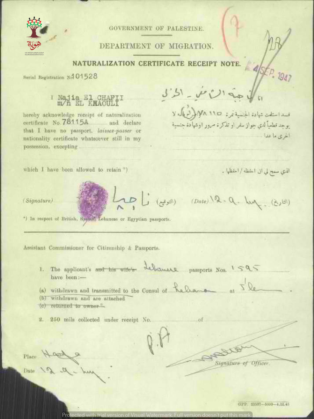 إيصال موقع من ناجية الشافعي الخولي باستلام شهادة الجنسية الفلسطينية