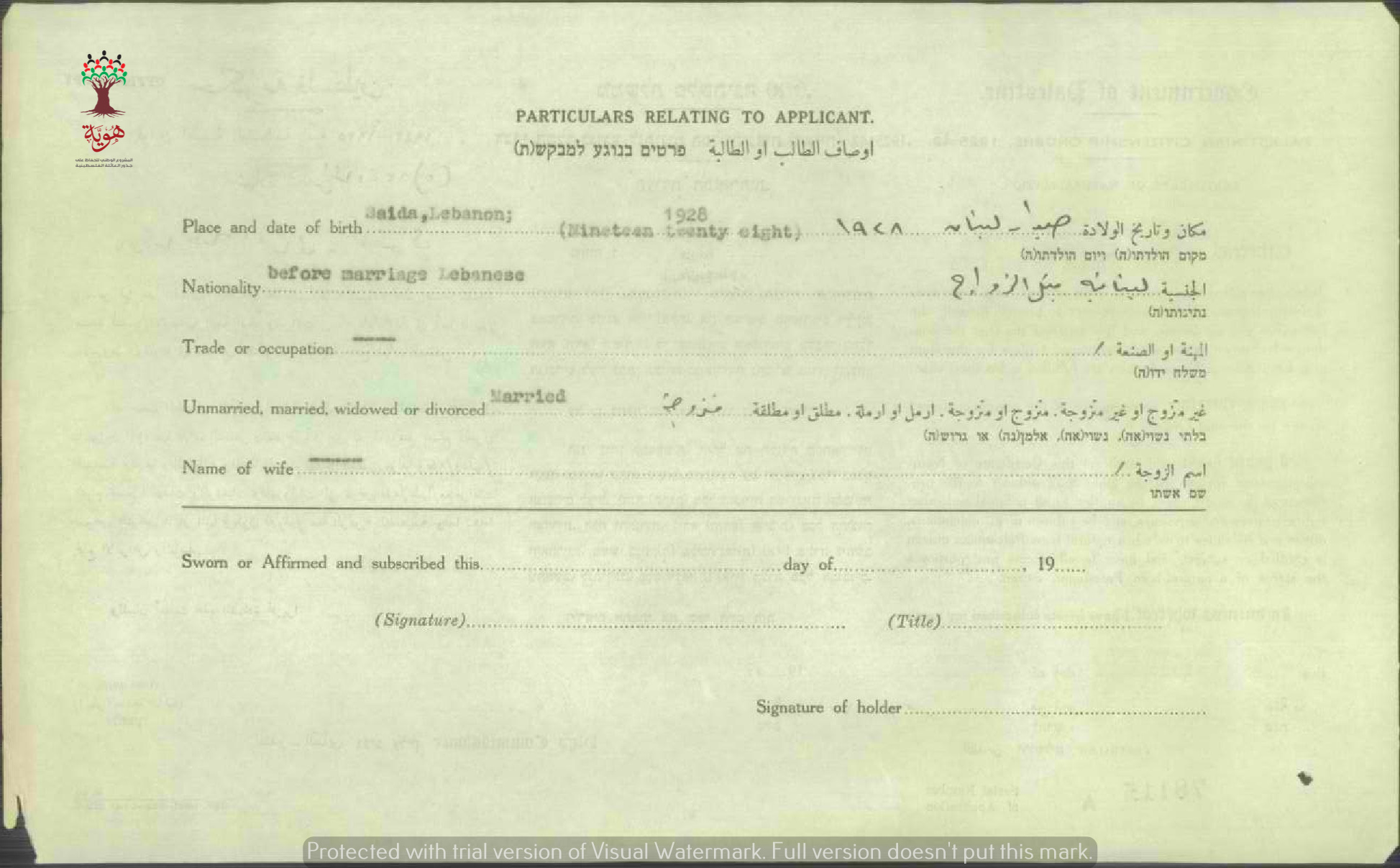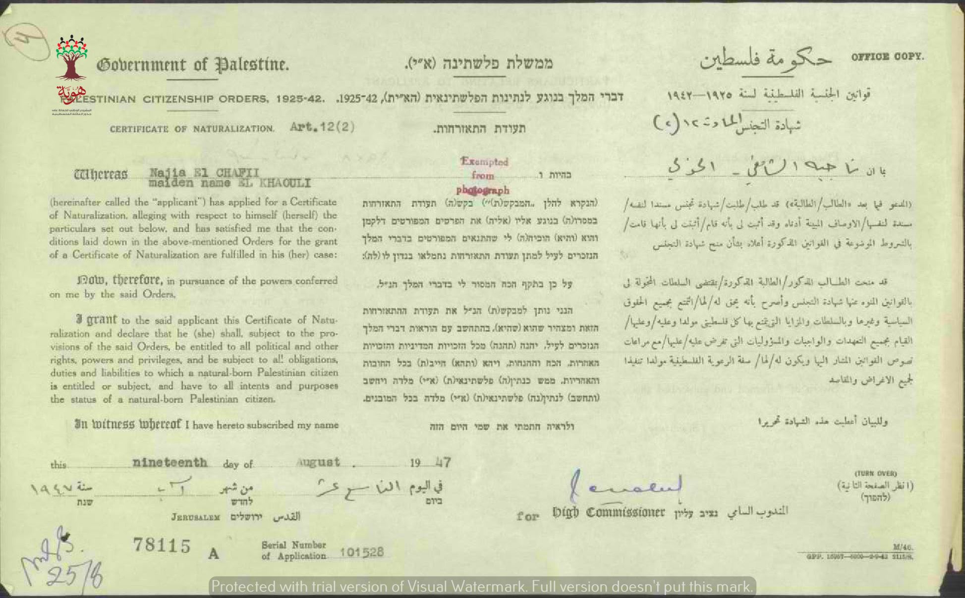 شهادة الجنسية الفلسطينية ل ناجية الشافعي خولي