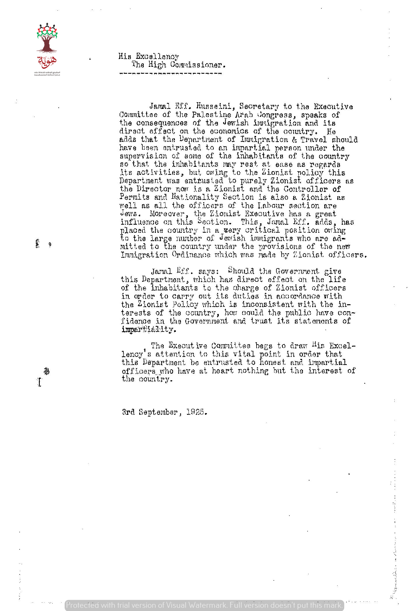 رسالة من المؤتمر العربي الفلسطيني الى المندوب السامي احتجاجا على هجرة اليهود الى فلسطين وتأثير ذلك إقتصاد البلاد والغلاء المعيشي.