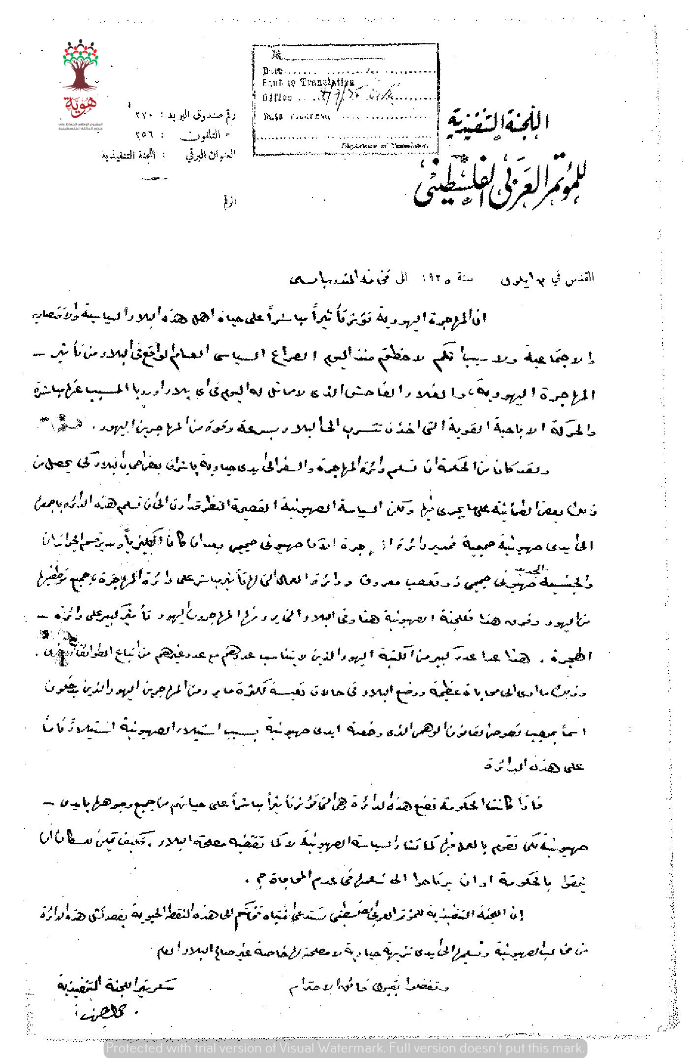 رسالة من المؤتمر العربي الفلسطيني الى المندوب السامي احتجاجا على هجرة اليهود الى فلسطين