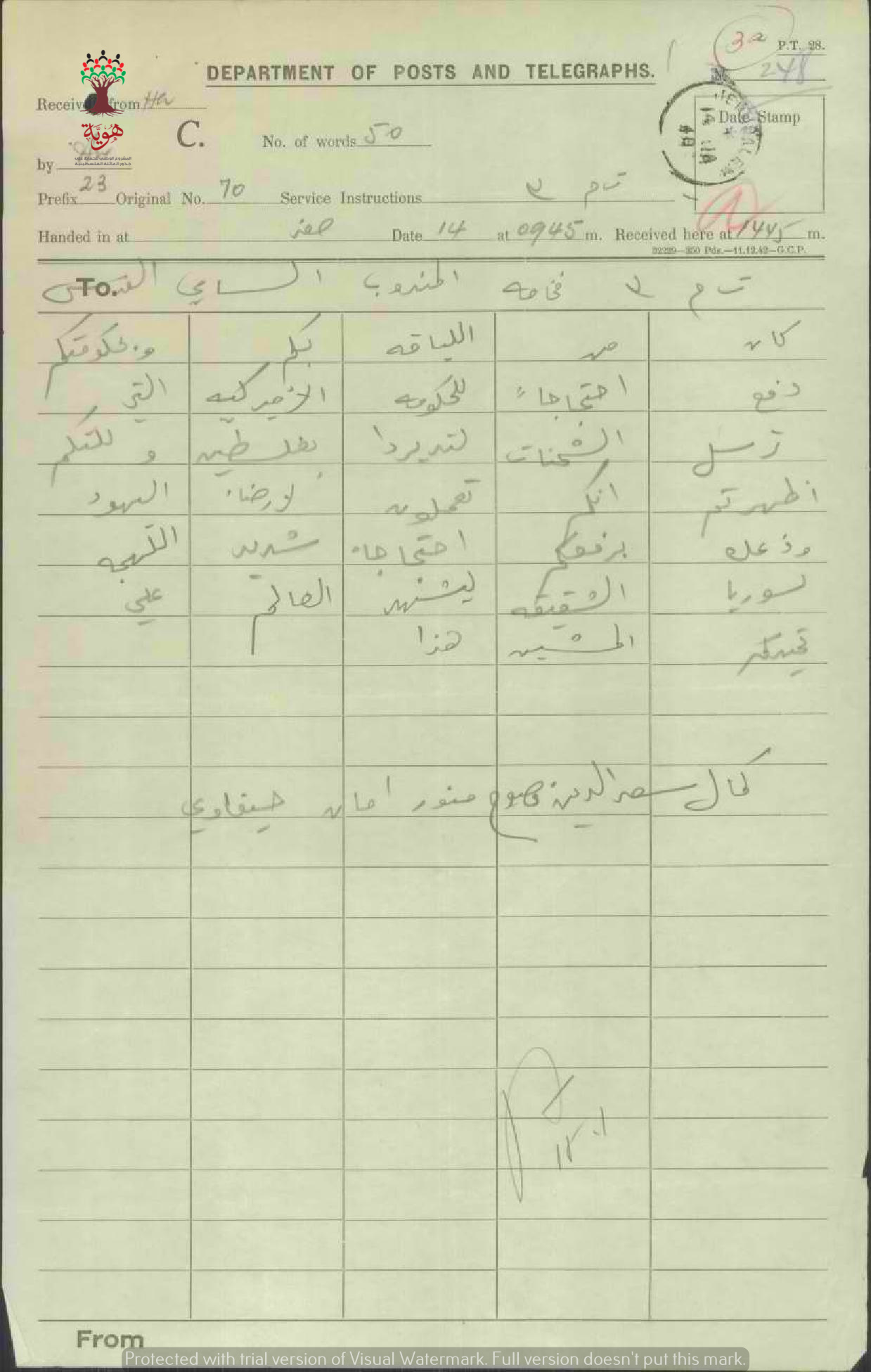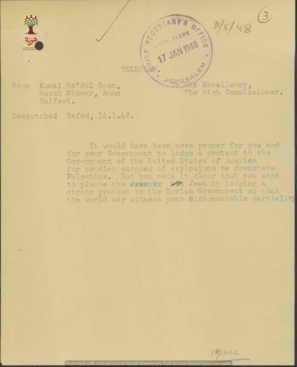 رسالة من كمال سعد الدين و نصوح منور و أمان حيفاوي الى المندوب السامي احتجاجا على دخول مسلحين عرب من سوريا