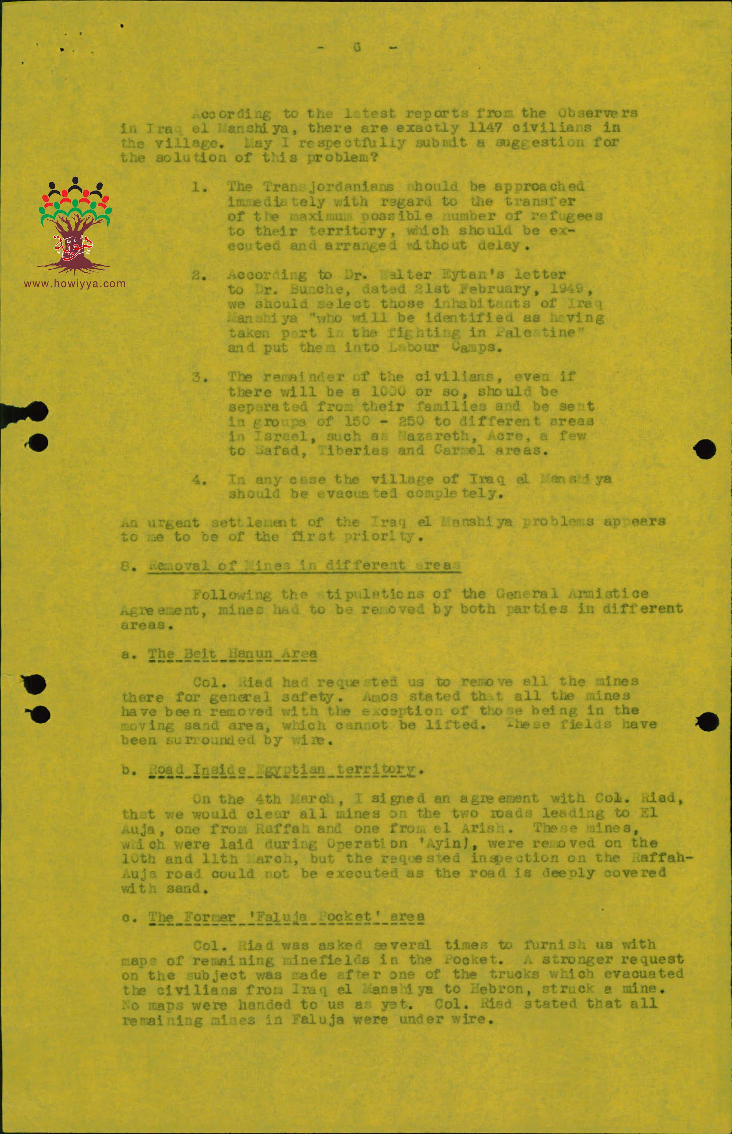 تقرير "إسرائيلي" سري عن قرية عراق المنشية يتضمن مخططاً لتفريغ القرية ممن تبقى فيها من السكان عام 1949 وكان عددهم يبلغ 1147 نسمة.