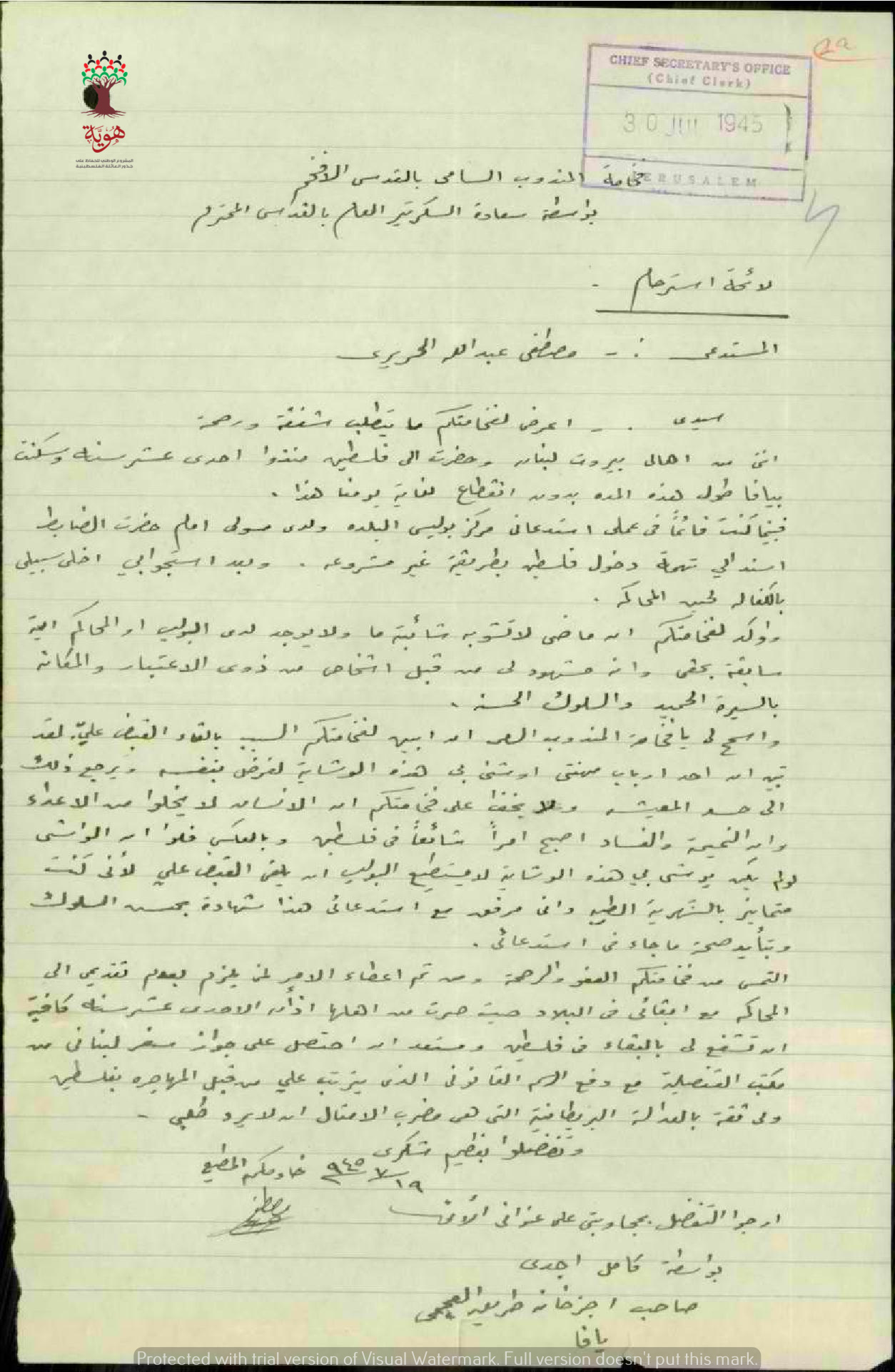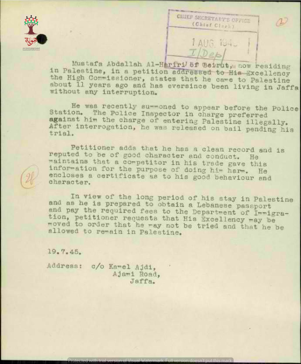 رسالة استرام من مصطفى عبد الله الحريري الى المندوب السامي بخصوص استبعاده من فلسطين ويفسر أن أحد ارباب عمله قد وشى به بسبب الحسد وذلك بعد اقامته 11 سنة في يافا دون تسجيل اي شكوى ضده طيلة هذه الفترة.