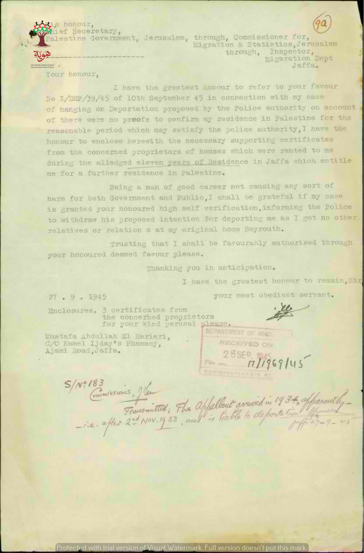 رسالة من مصطفى الحريري الى رئيس السكرتارية بخصوص الدليل على وجوده في فلسطين لمدة 11 سنة