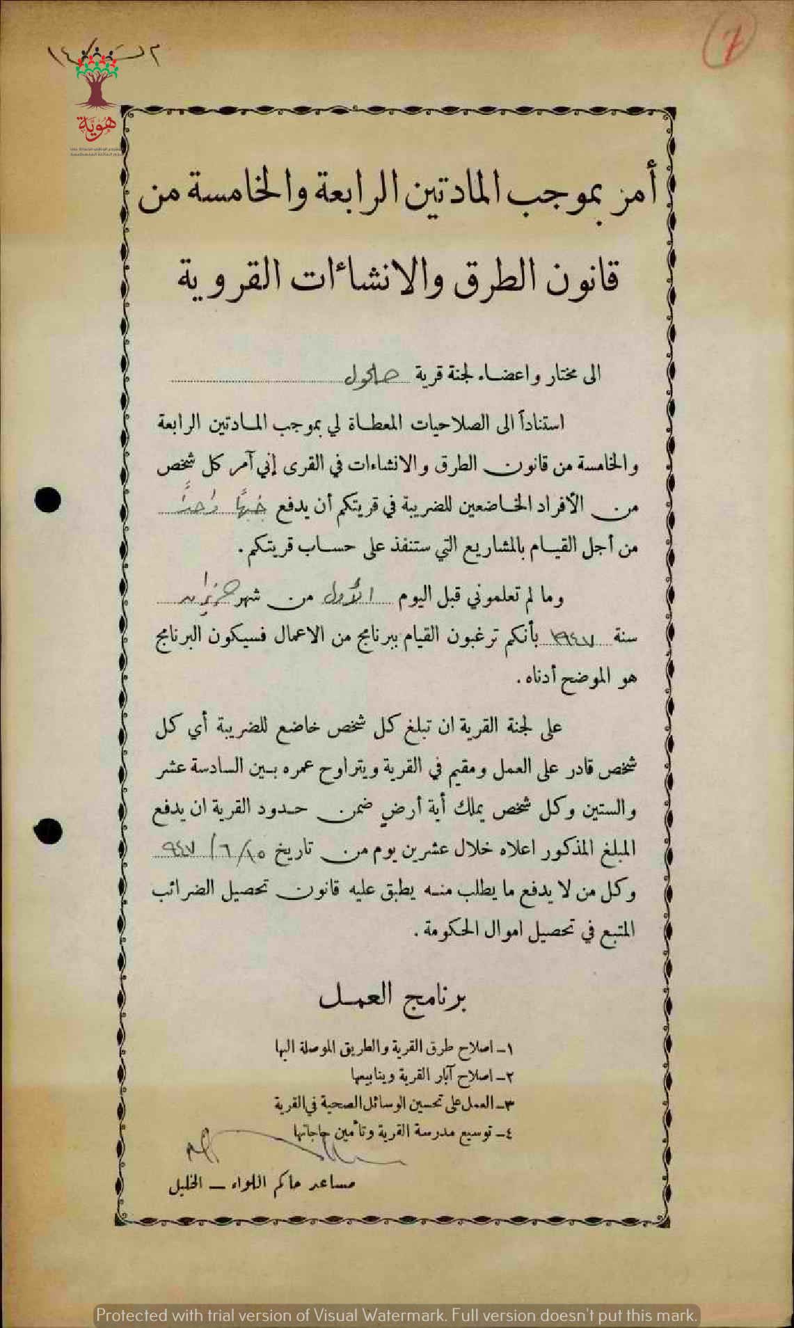 أمر صادر عن حاكم لواء الخليل بالمبلغ المترتب على أهالي قرية حلحول لأعمال الاصلاحات في القرية