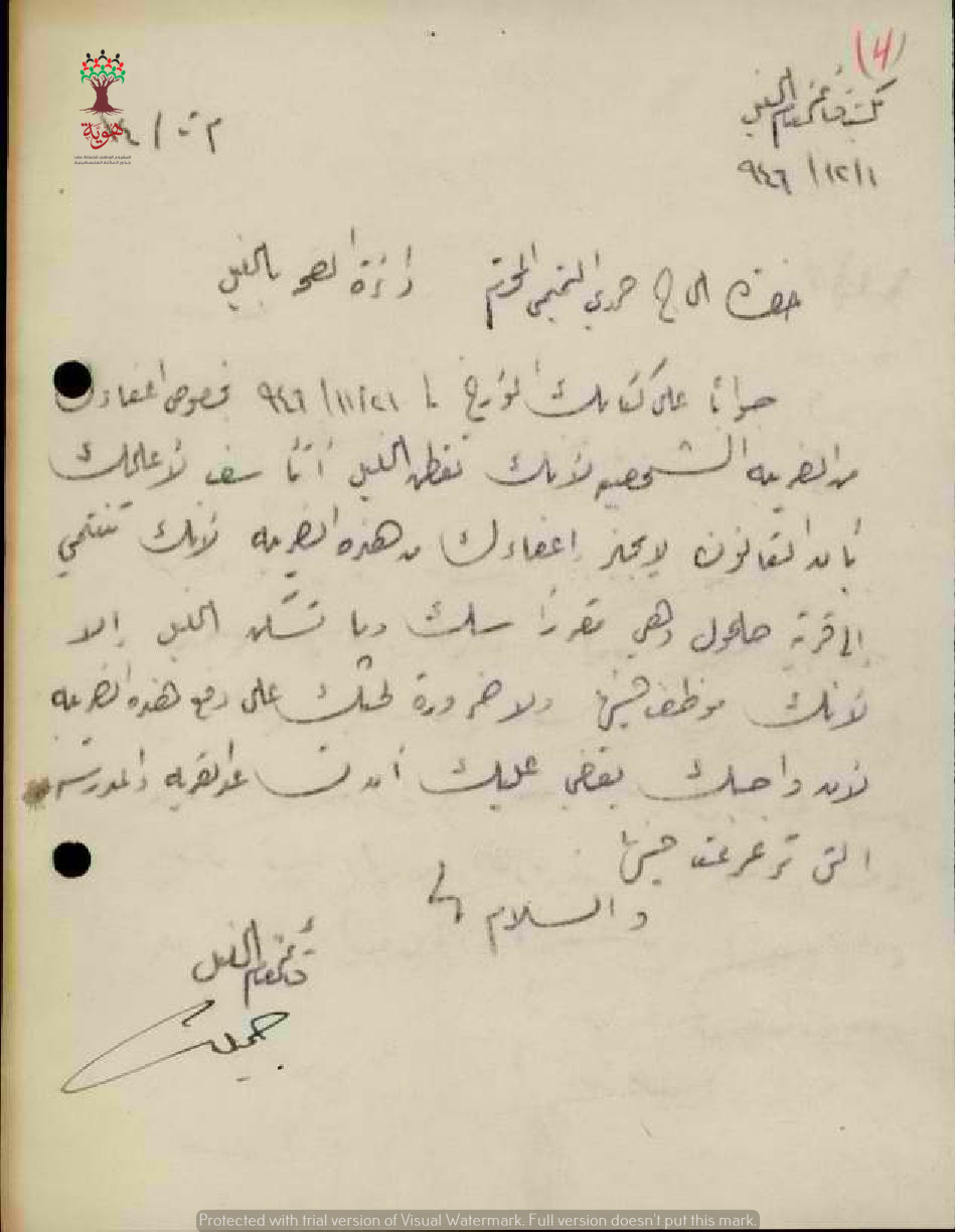 رسالة من قائمقام الخليل الى حمدي التميمي بخصوص عدم اعهفائه من الضريبة