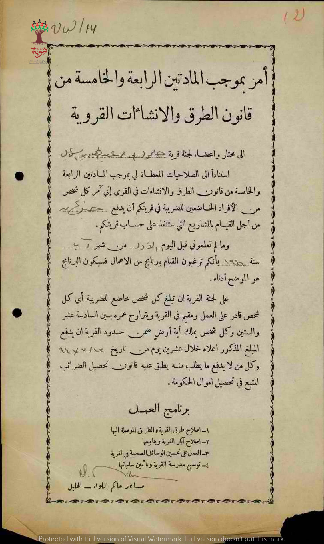 أمر صادر عن حاكم لواء الخليل بالمبلغ المترتب على أهالي قرية حلحول لأعمال الاصلاحات في القرية مرفقا ببرنامج الإصلاحات.