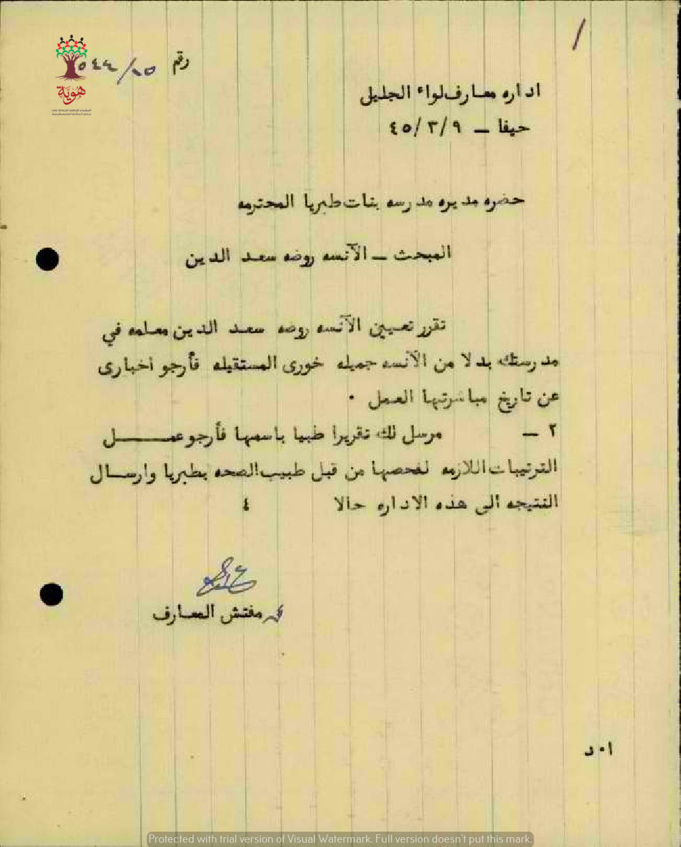 تعيين المعلمة روضة سليمان سعد الدين في مدرسة بنات طبريا بدل من الآنسة جميلة خوري