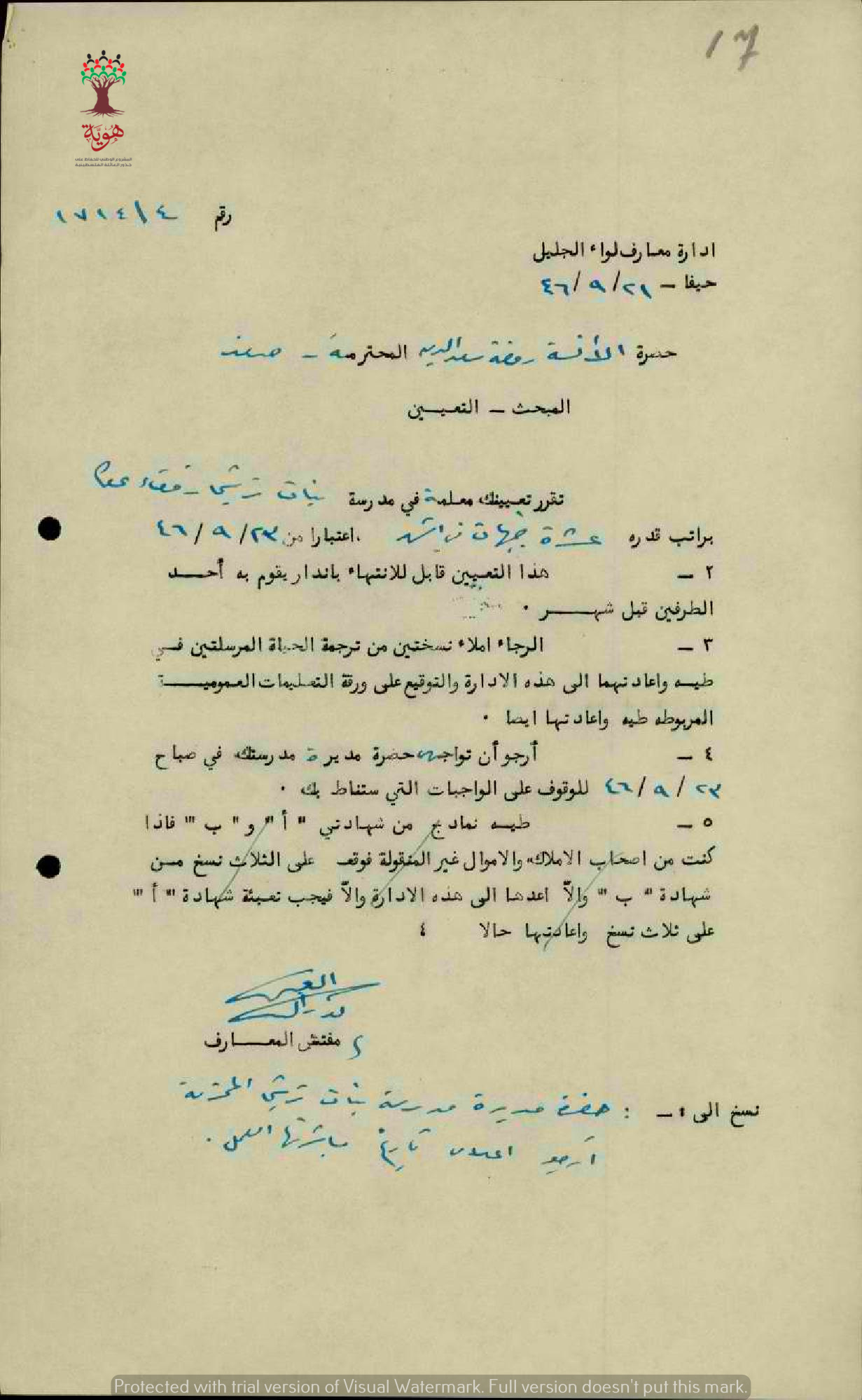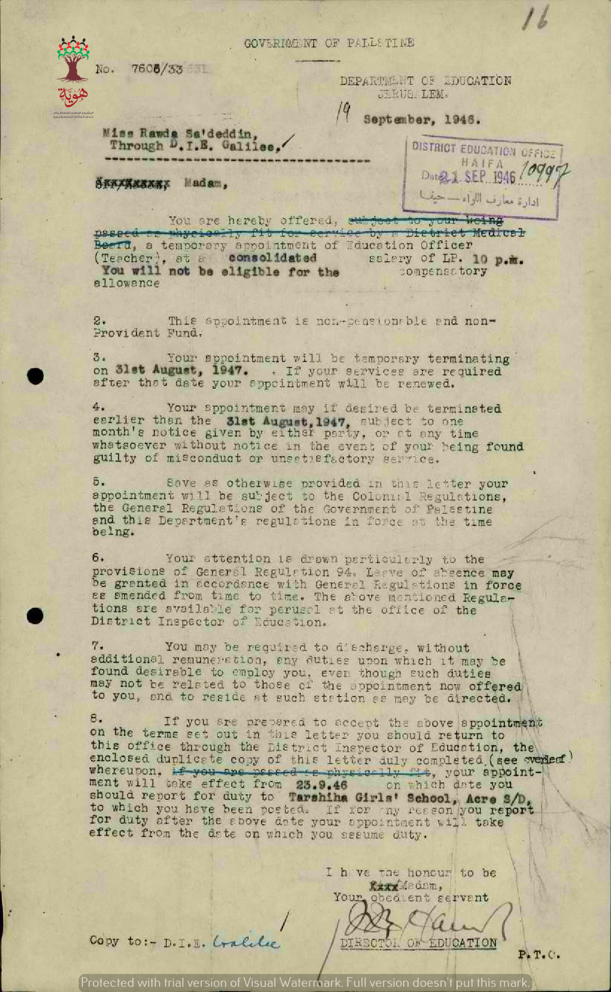 رسائل من إدارة المعارف الى المعلمة روضة سعد الدين بخصوص تعيينها في مدرسة بنات ترشيحا بشكل مؤقت براتب عشر جنيهات في الشهر.