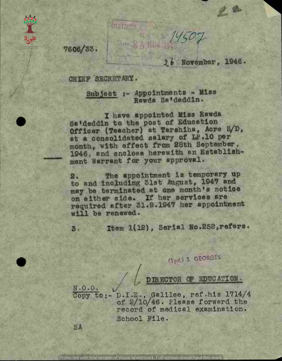 رسالة من مدير المعارف الى رئيس السكرتارية بخصوص تعيين المعلمة روضة سعد الدين في مدرسة ترشيحا
