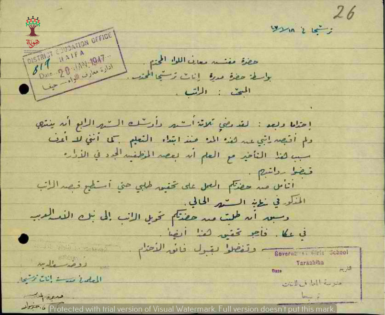 رسالة من المعلمة روضة سعد الدين الى مفتش المعارف بخصوص عدم حصولها على راتبها لمدة ثلاثة أشهر.