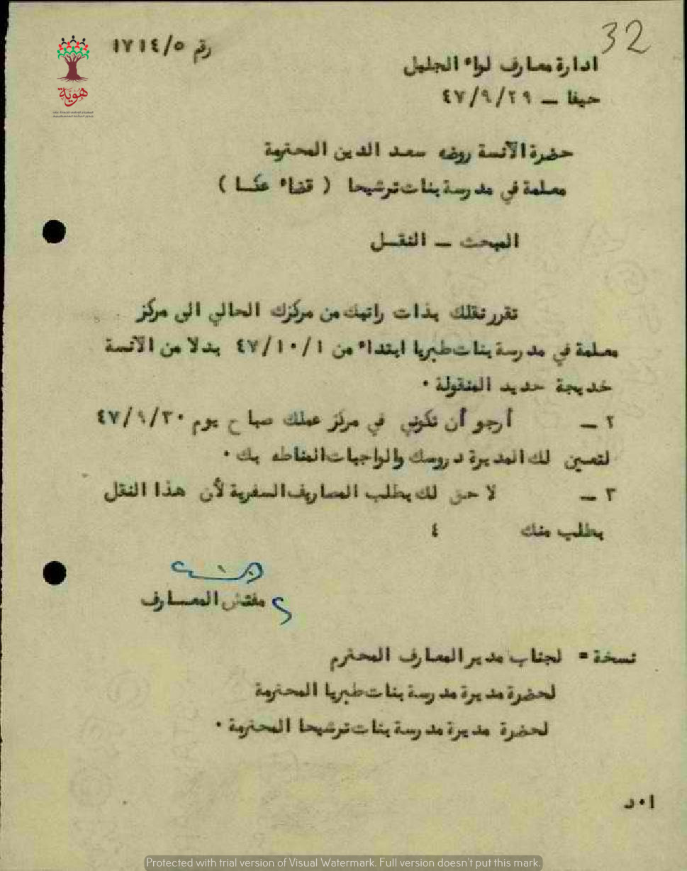 نقل المعلمة روضة سعد الدين من بنات ترشيحا الى بنات طبريا