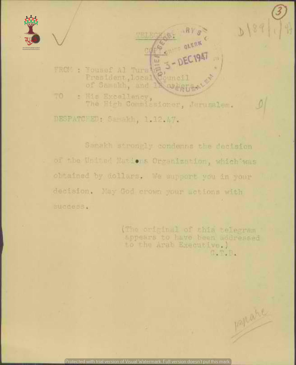 تلغراف مرسل من أهالي سمخ الى المندوب السامي احتجاجا على قرار تقسيم فلسطين
