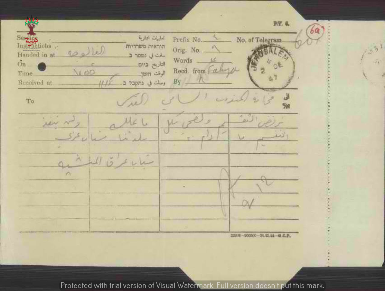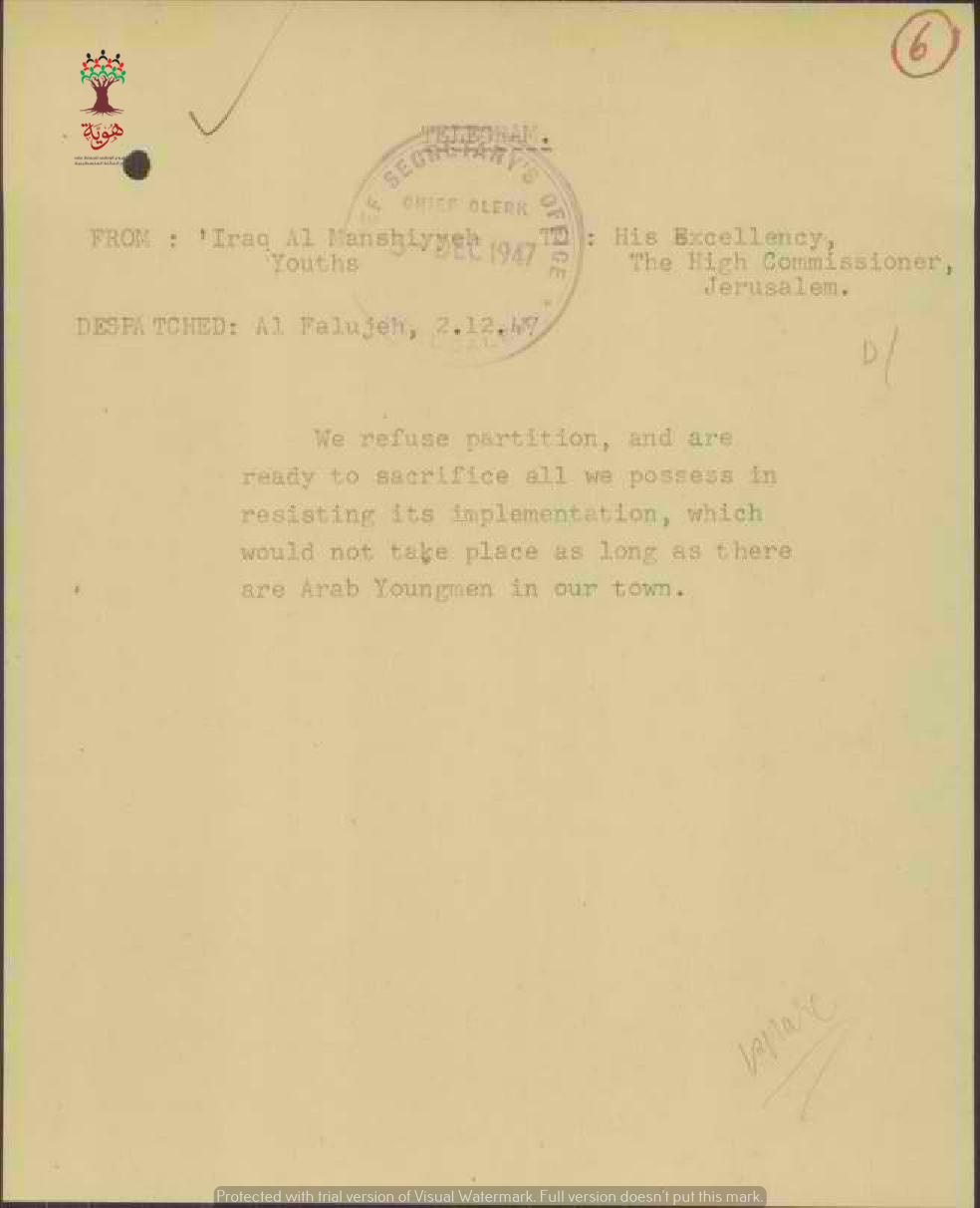 تلغراف مرسل من شباب عراق المنشية/الفالوجة الى المندوب السامي احتجاجا على قرار تقسيم فلسطين